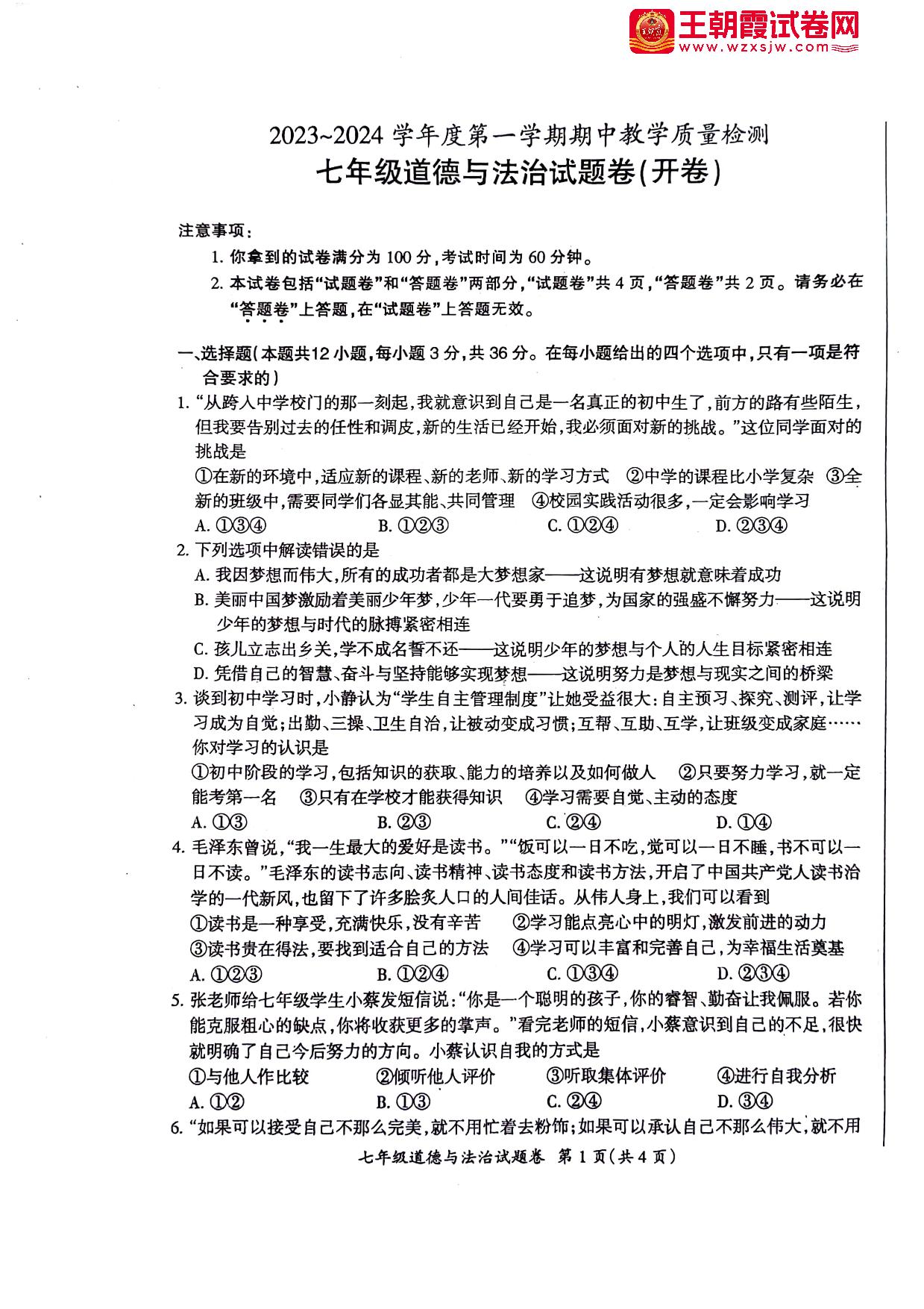 安徽省滁州市第六中学2023-2024学年度第一学期期中教学质量检测七年级道德与法治(人教版)