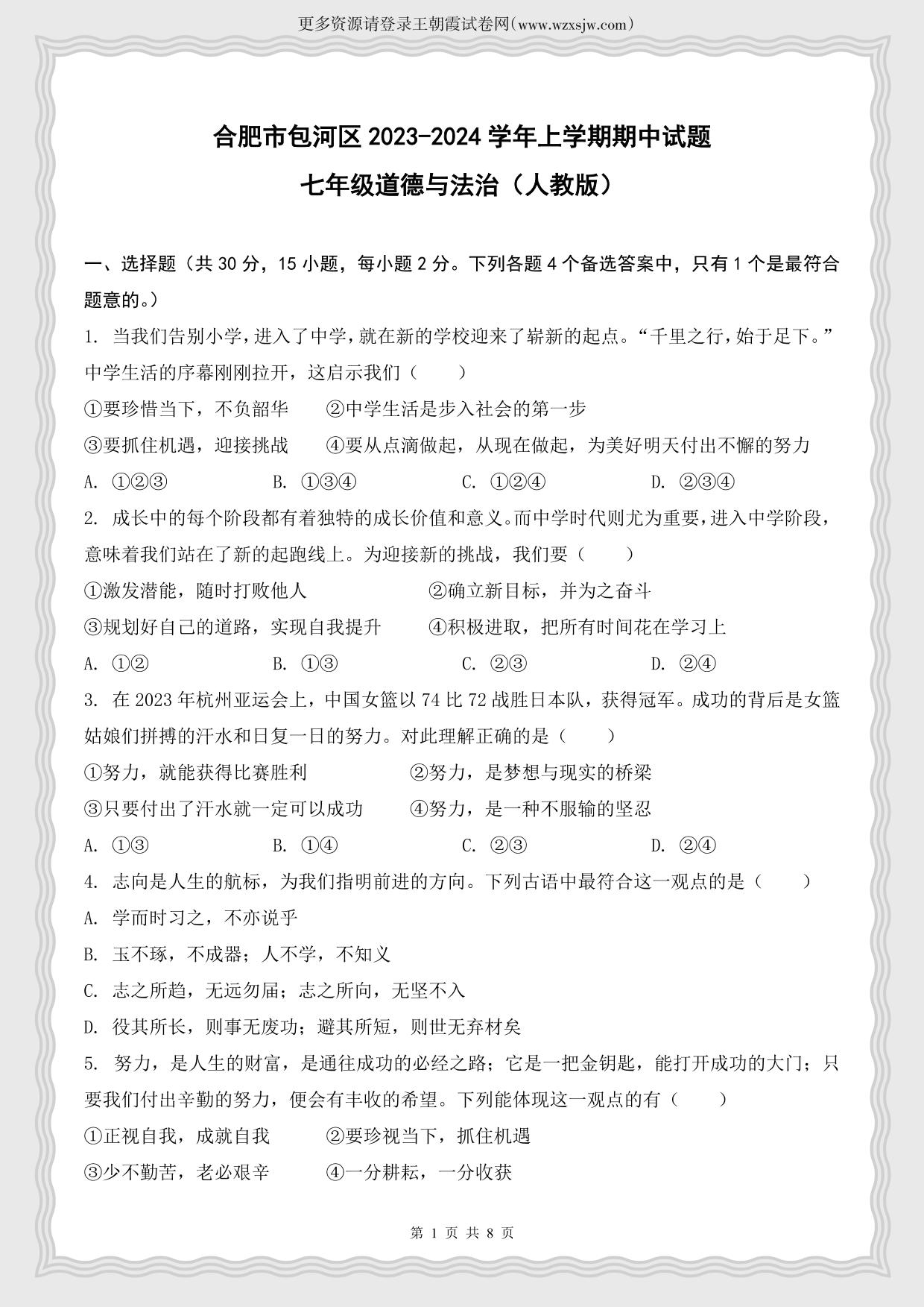 安徽省合肥市包河区2023-2024学年上学期期中试题七年级道德与法治(人教版)