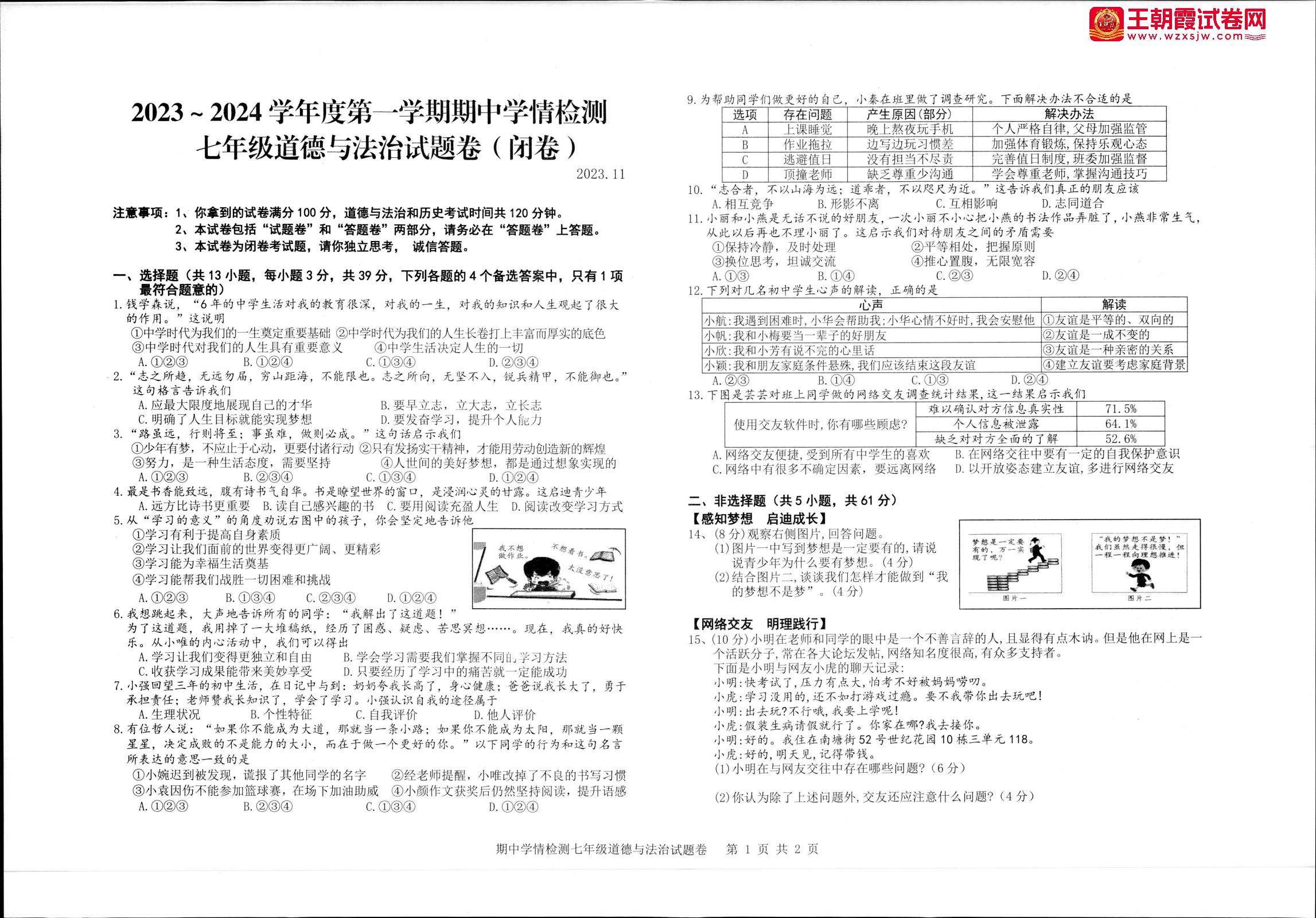 安徽省安庆市怀宁县2023-2024学年度第一学期期中学情检测七年级道德与法治(人教版)