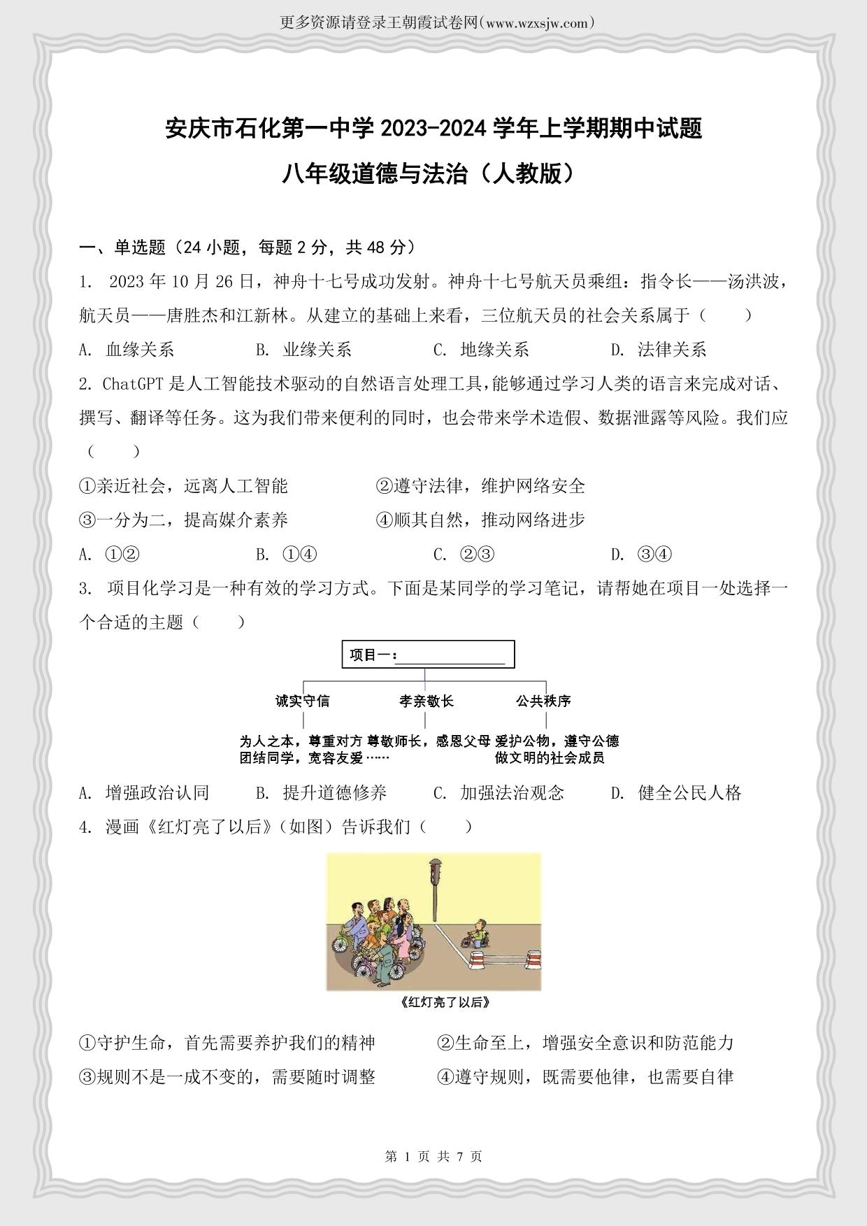 安徽省安庆市石化第一中学2023-2024学年上学期期中试题八年级道德与法治(人教版)