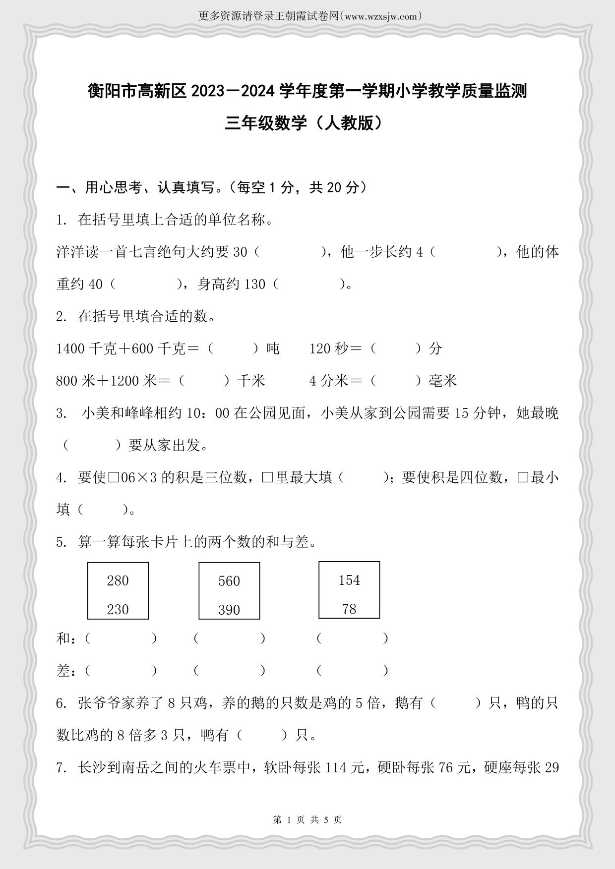 湖南省衡阳市高新区2023-2024学年度第一学期小学教学质量监测三年级数学(人教版)
