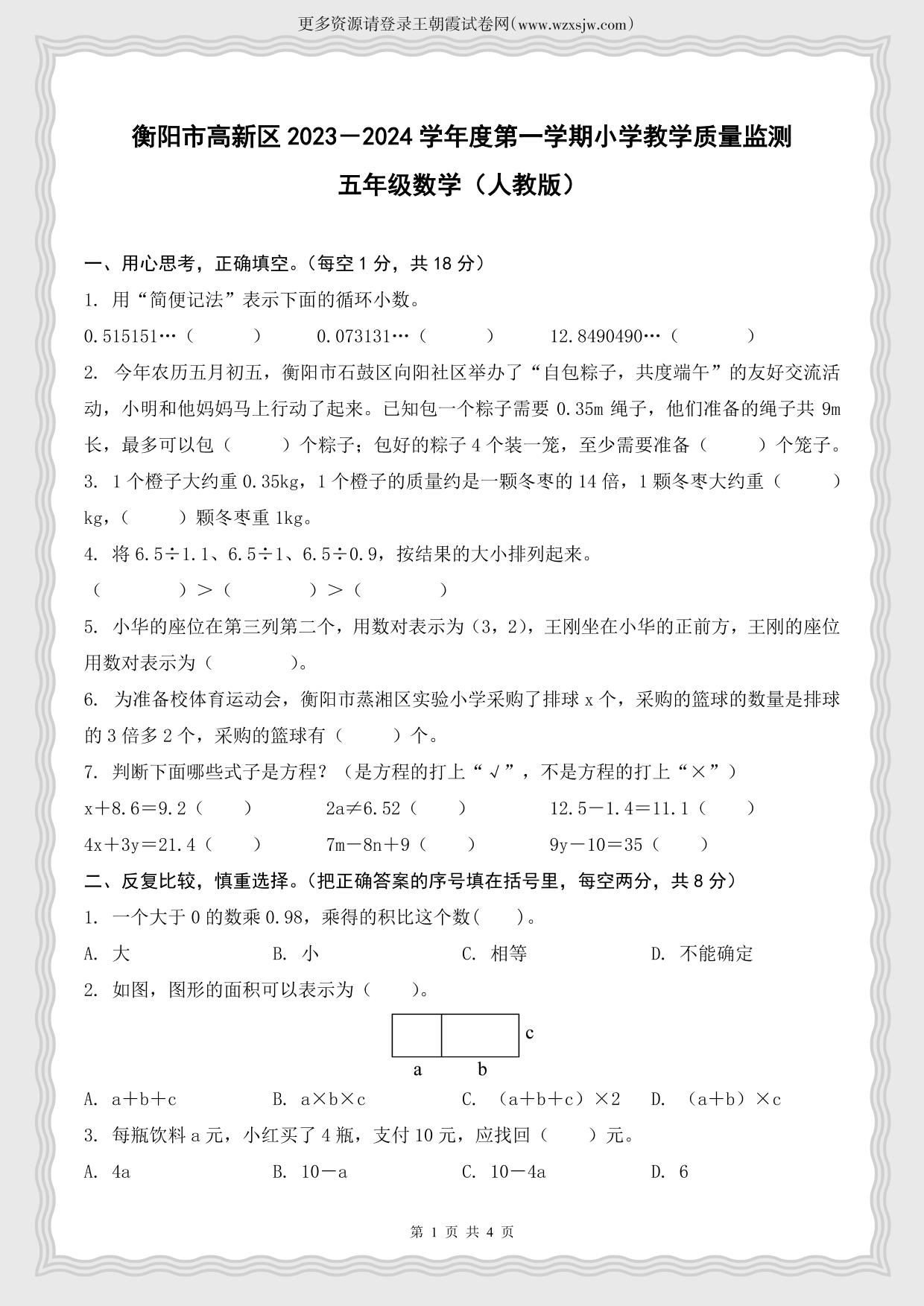 湖南省衡阳市高新区2023-2024学年度第一学期小学教学质量监测五年级数学(人教版)