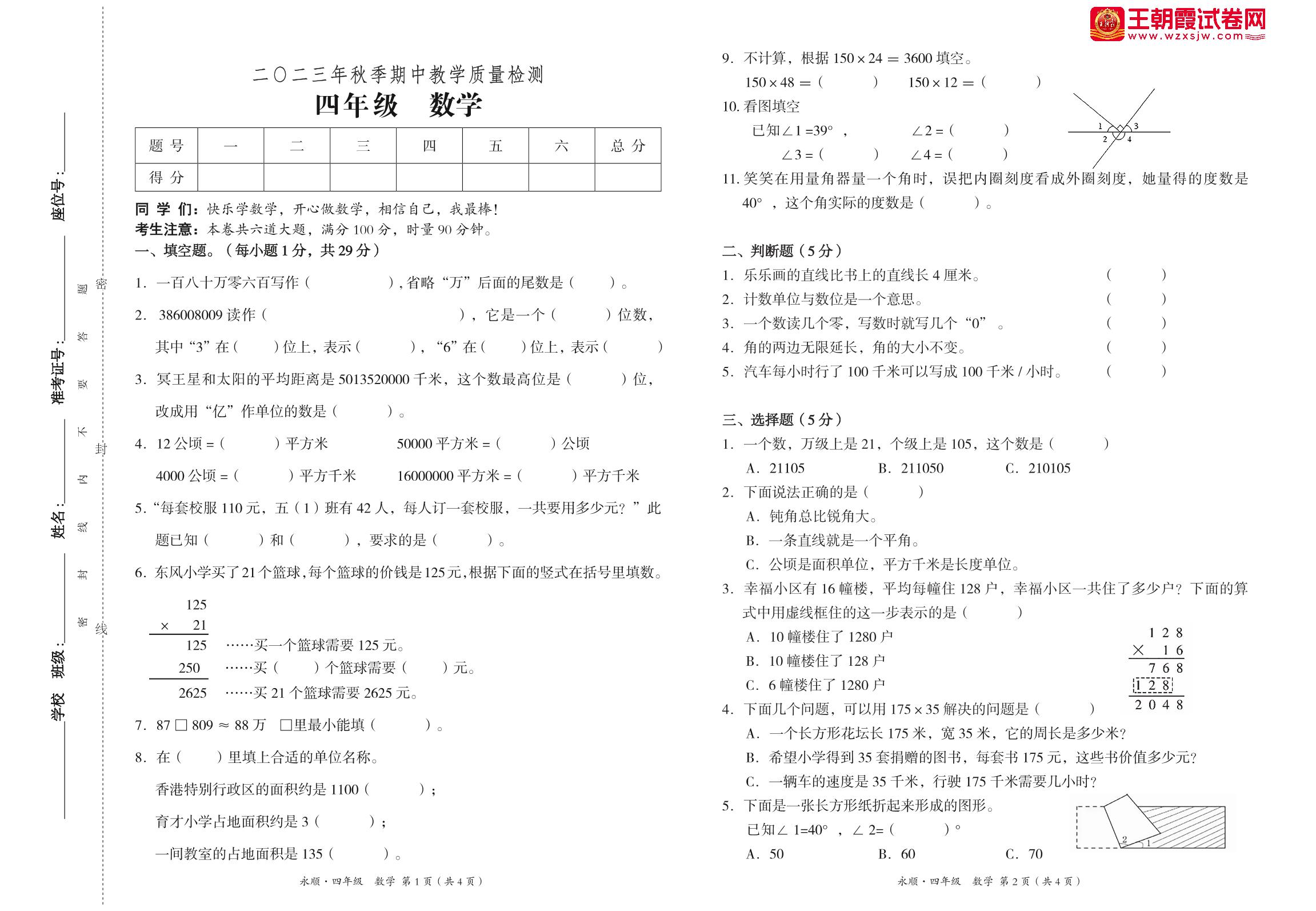 湖南省湘西州永顺县2023-2024学年上学期期中教学质量检测四年级数学(人教版)