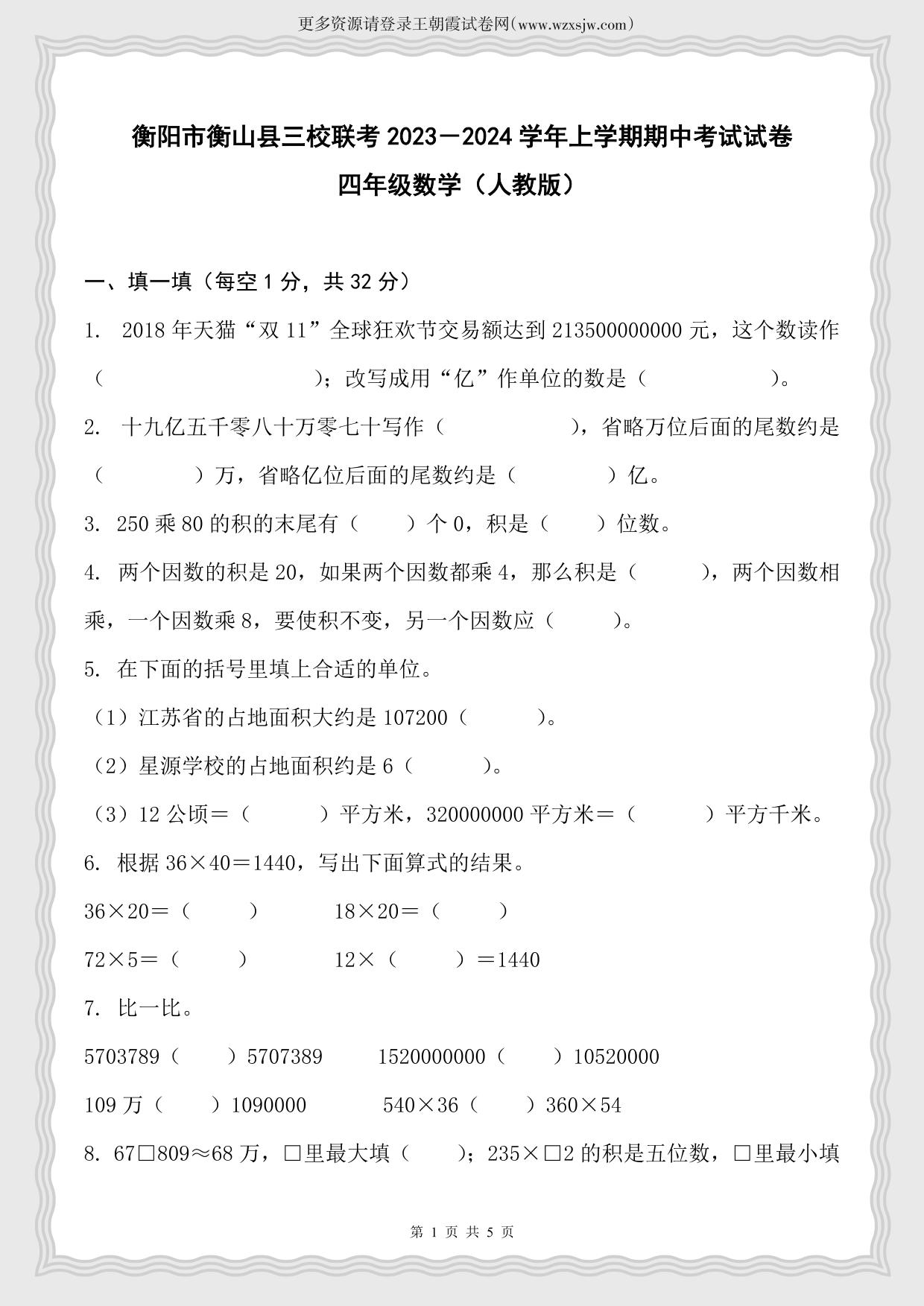 湖南省衡阳市衡山县三校联考2023-2024学年上学期期中考试试卷四年级数学(人教版)