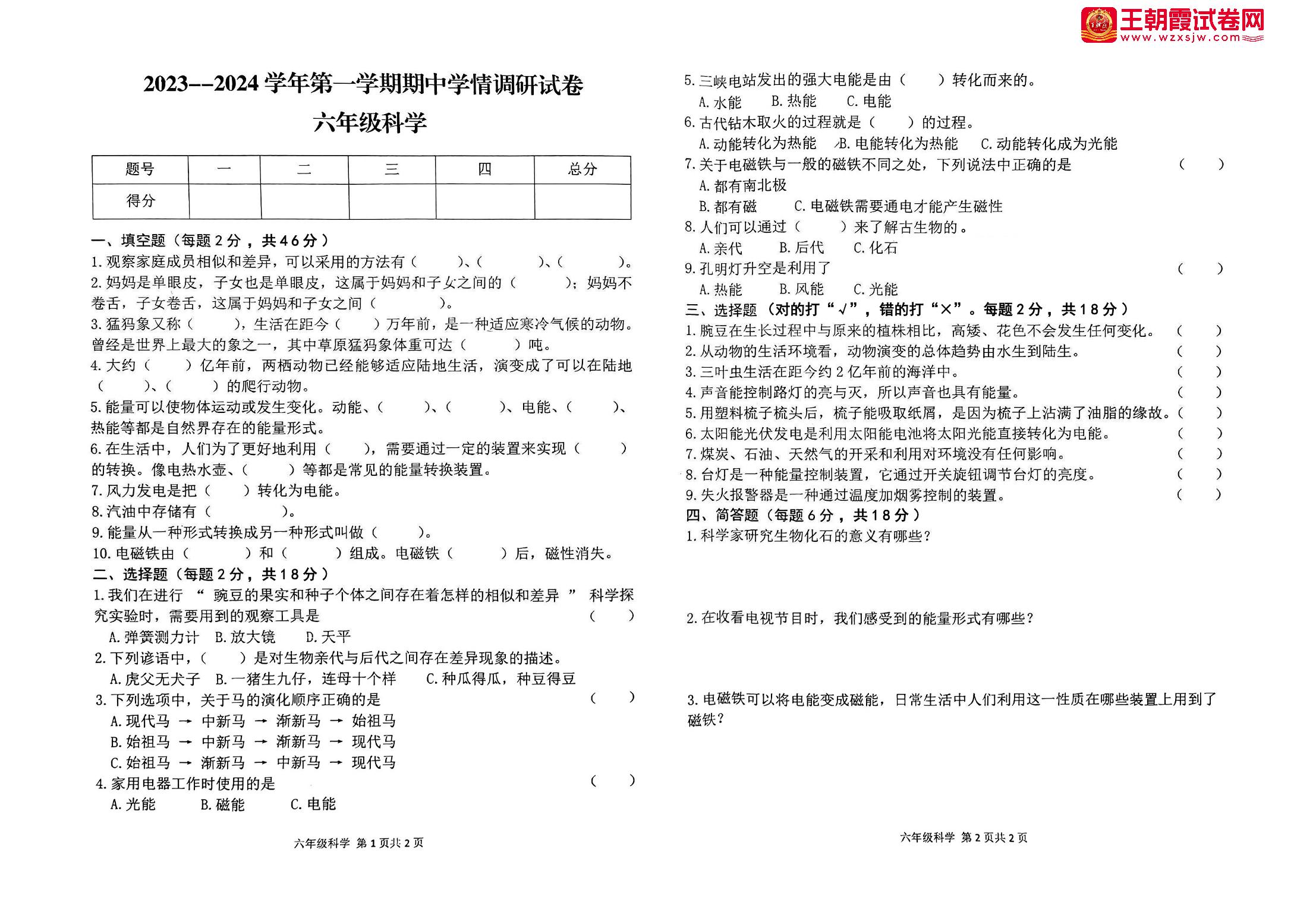 河南省周口市郸城县2023-2024学年第一学期期中学情调研试卷六年级科学(冀人版)