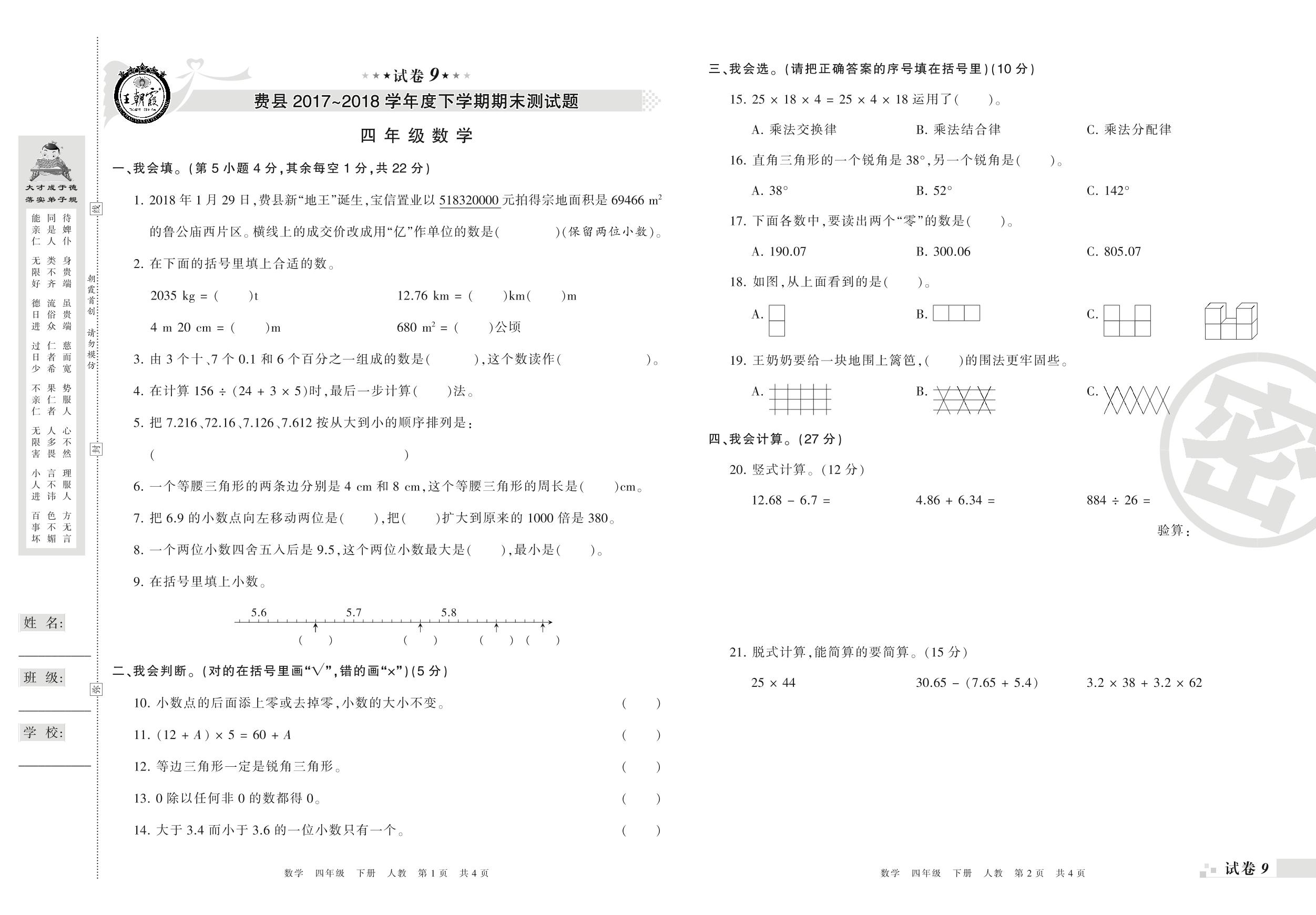 2017-2018学年第二学期临沂市费县四年级数学试卷(人教版)【9】
