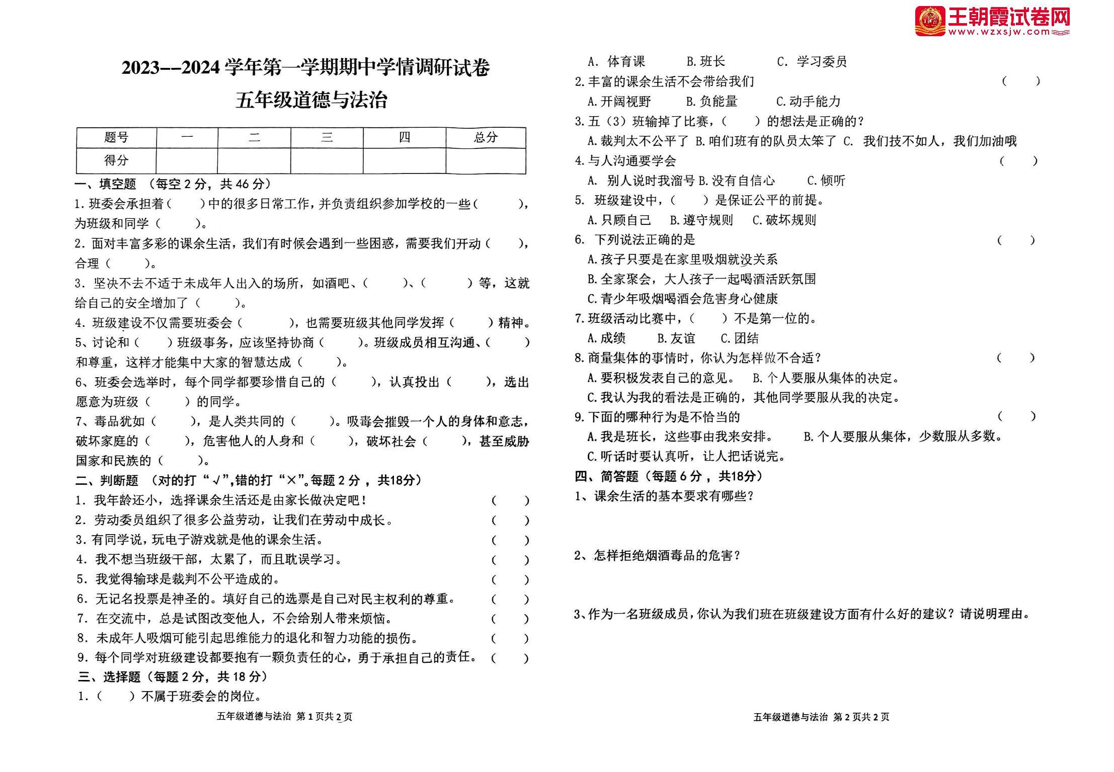 河南省周口市郸城县2023-2024学年第一学期期中学情调研试卷五年级道德与法治(人教版)