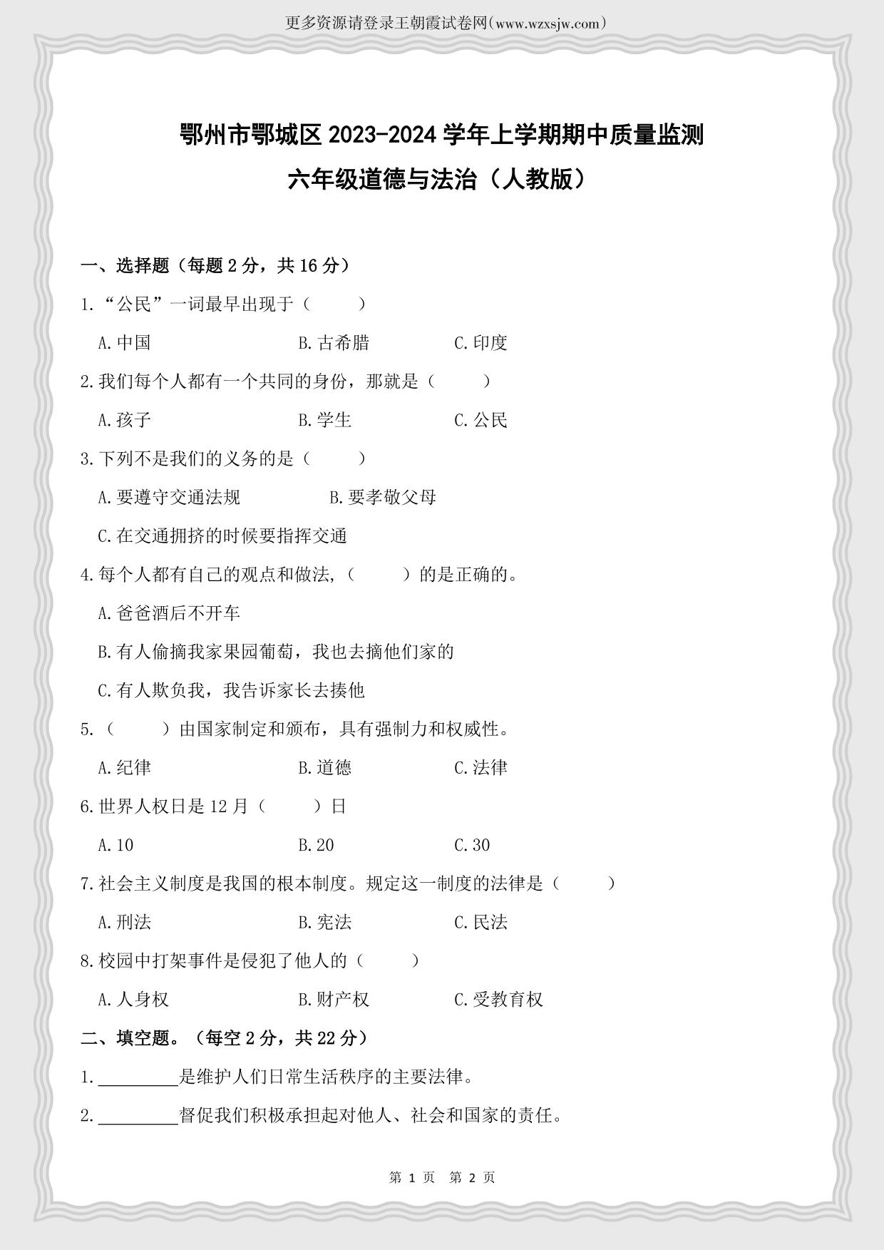 湖北省鄂州市鄂城区2023-2024学年上学期期中质量监测六年级道德与法治(人教版)