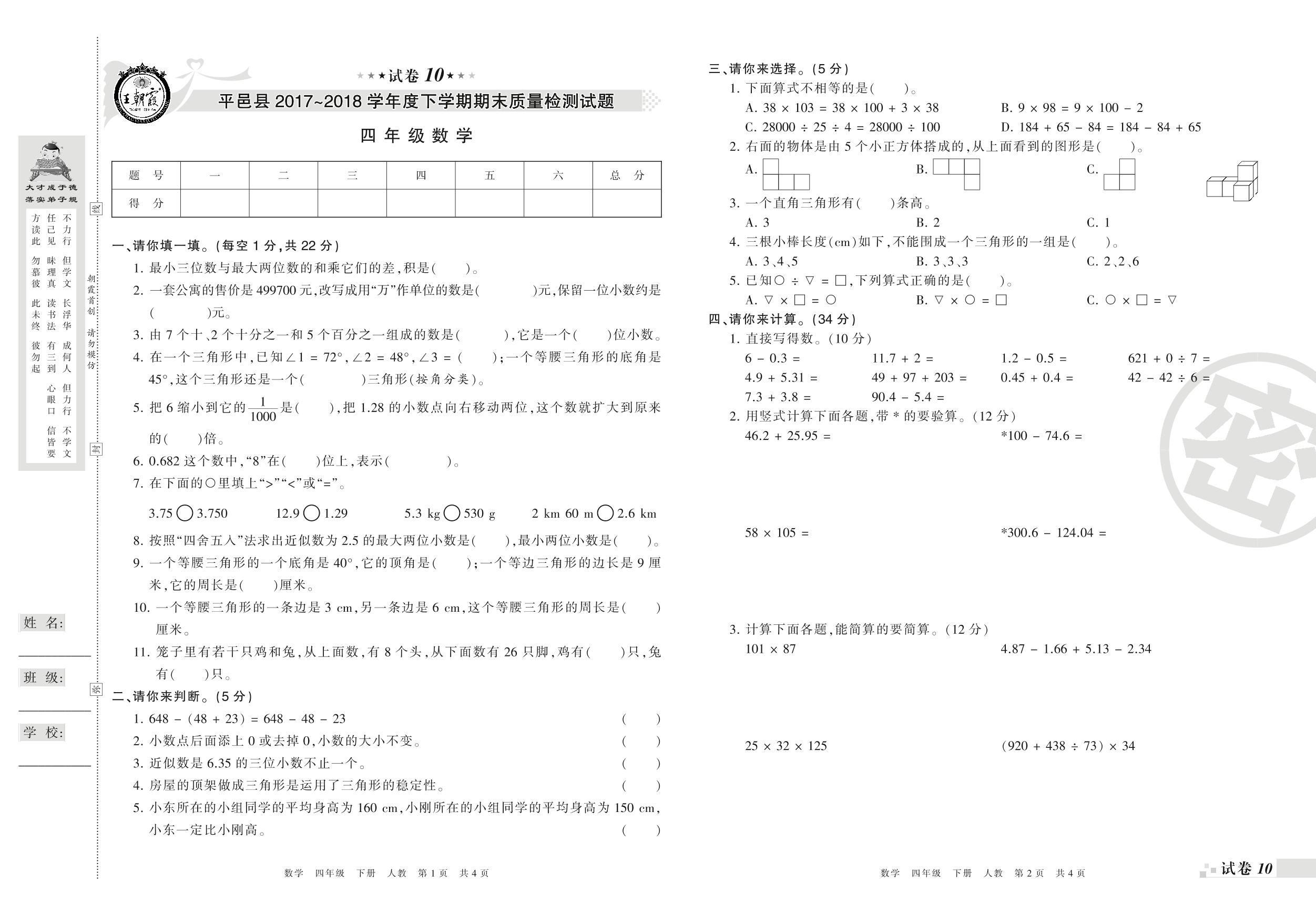 2017-2018学年第二学期临沂市平邑县四年级数学试卷(人教版)【10】
