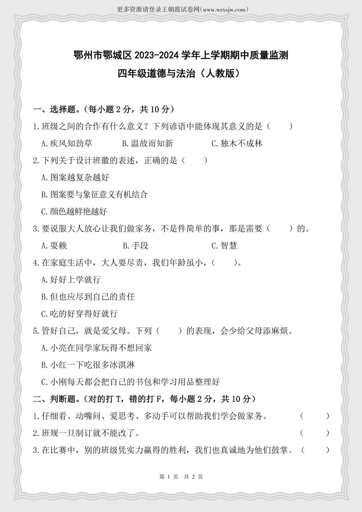 湖北省鄂州市鄂城区2023-2024学年上学期期中质量监测四年级道德与法治(人教版)