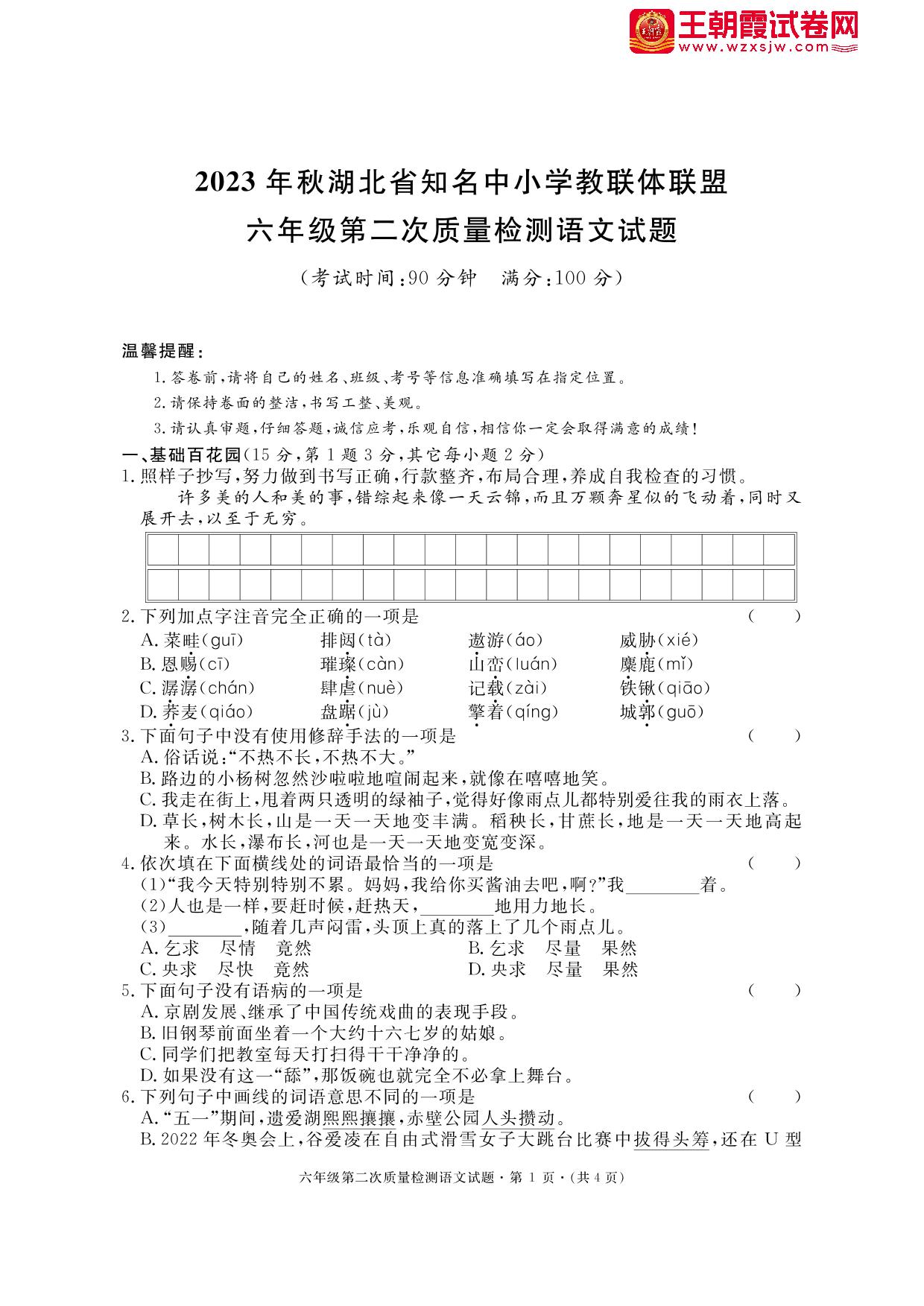 湖北省知名中小学教联体联盟2023-2024学年上学期第二次质量检测(月考)六年级语文(人教版)