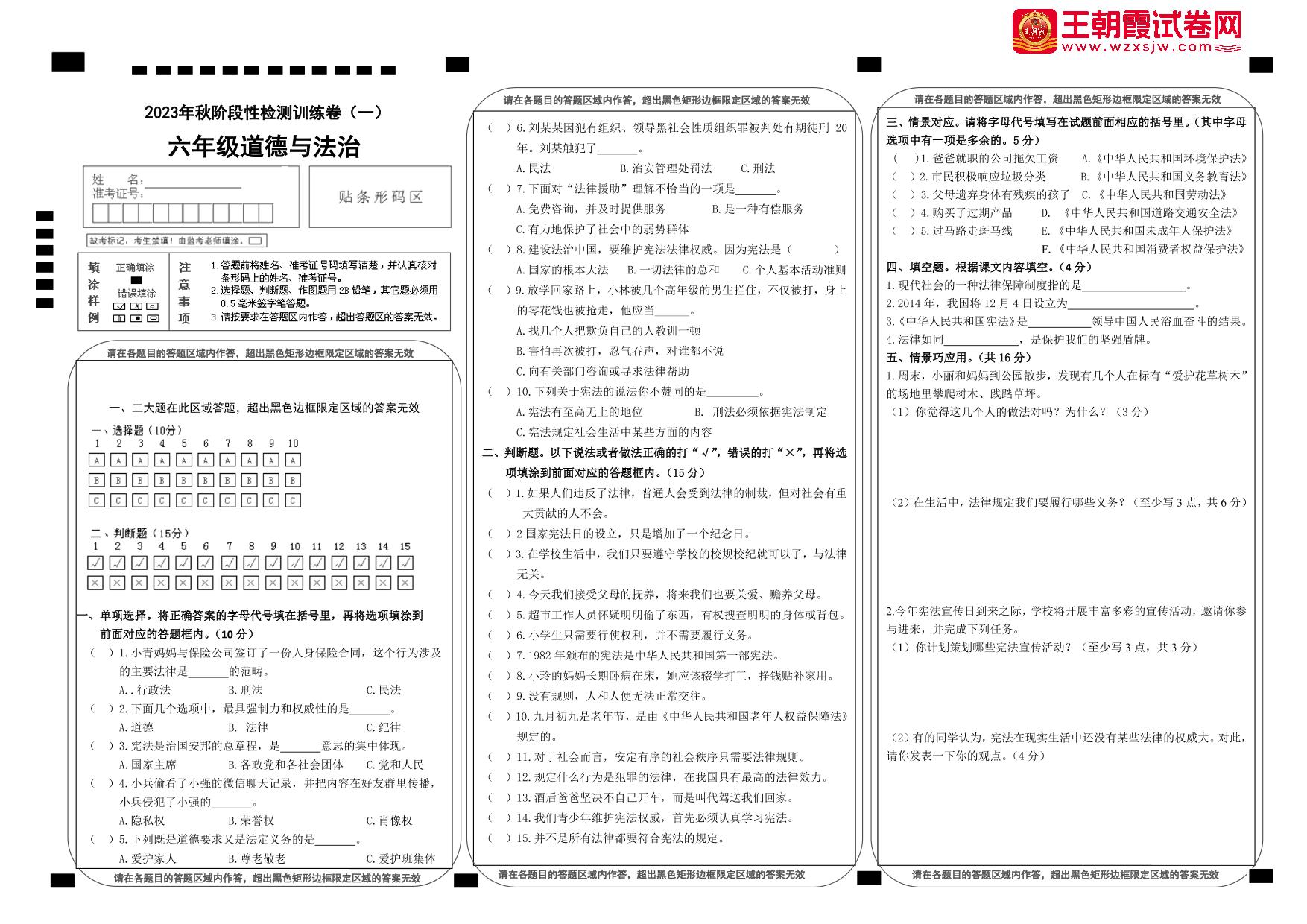 湖北省恩施土家族苗族自治州宣恩县2023-2024学年上学期阶段性检测训练卷一(月考)六年级道德与法治(人教版)