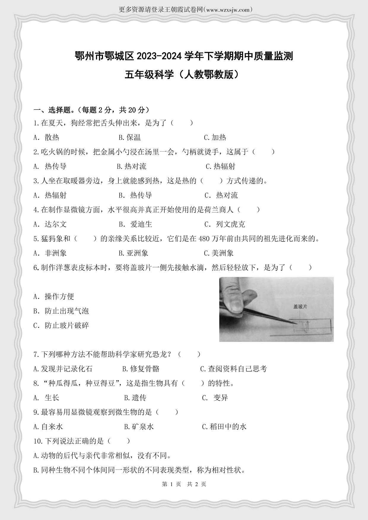 湖北省鄂州市鄂城区2023-2024学年上学期期中质量监测五年级科学(人教鄂教版)