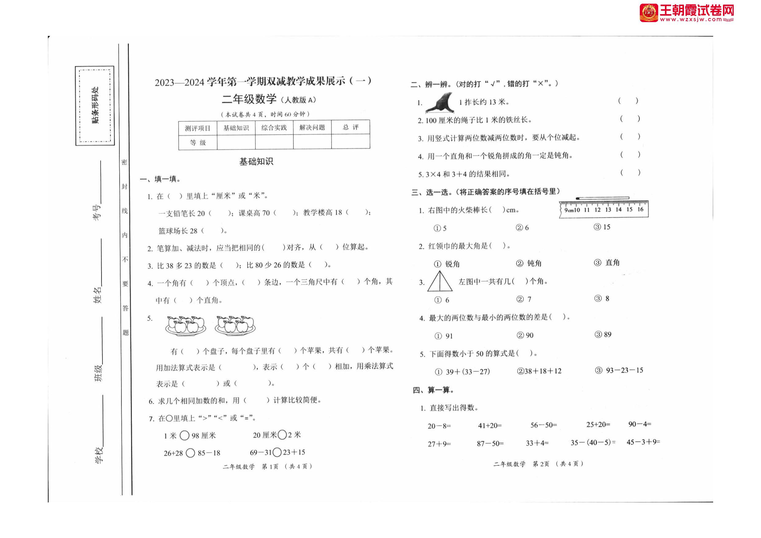 山西省忻州市岢岚县2023-2024学年第一学期双减效果展示(月考)二年级数学(人教版)
