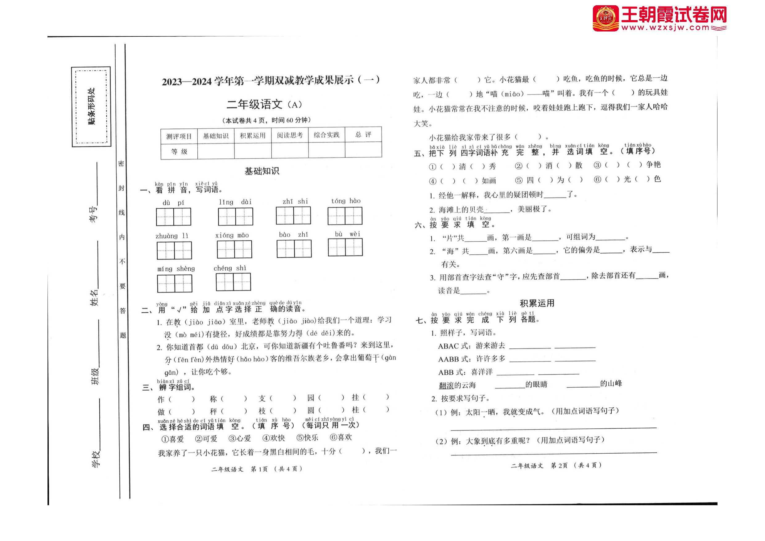 二年级语文人教版上册期中卷