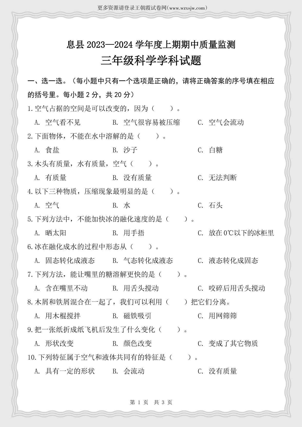 河南省信阳市息县2023-2024学年度上学期期中质量监测试题三年级科学(教科版)