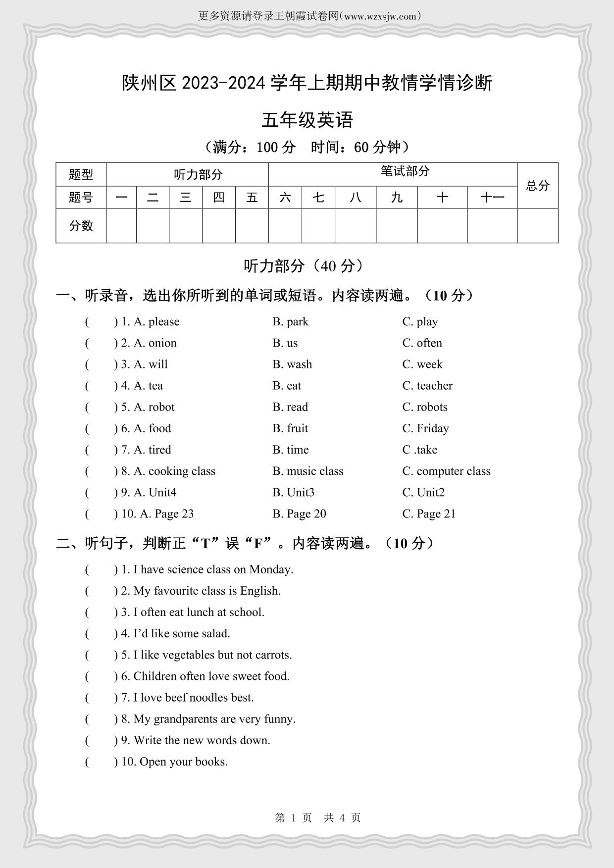 河南省三门峡市陕州区2023-2024学年上学期期中教情学情诊断试卷五年级英语(人教PEP版)