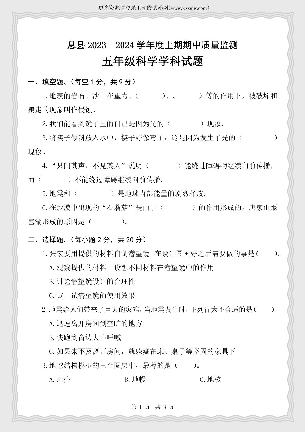 河南省信阳市息县2023-2024学年度上学期期中质量监测试题五年级科学(教科版)