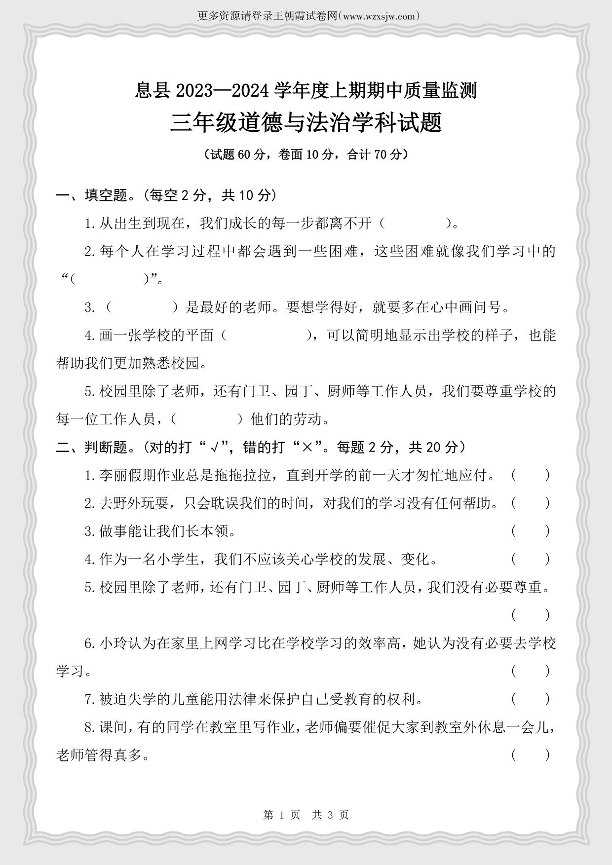 三年级道德与法治人教版上册期中卷