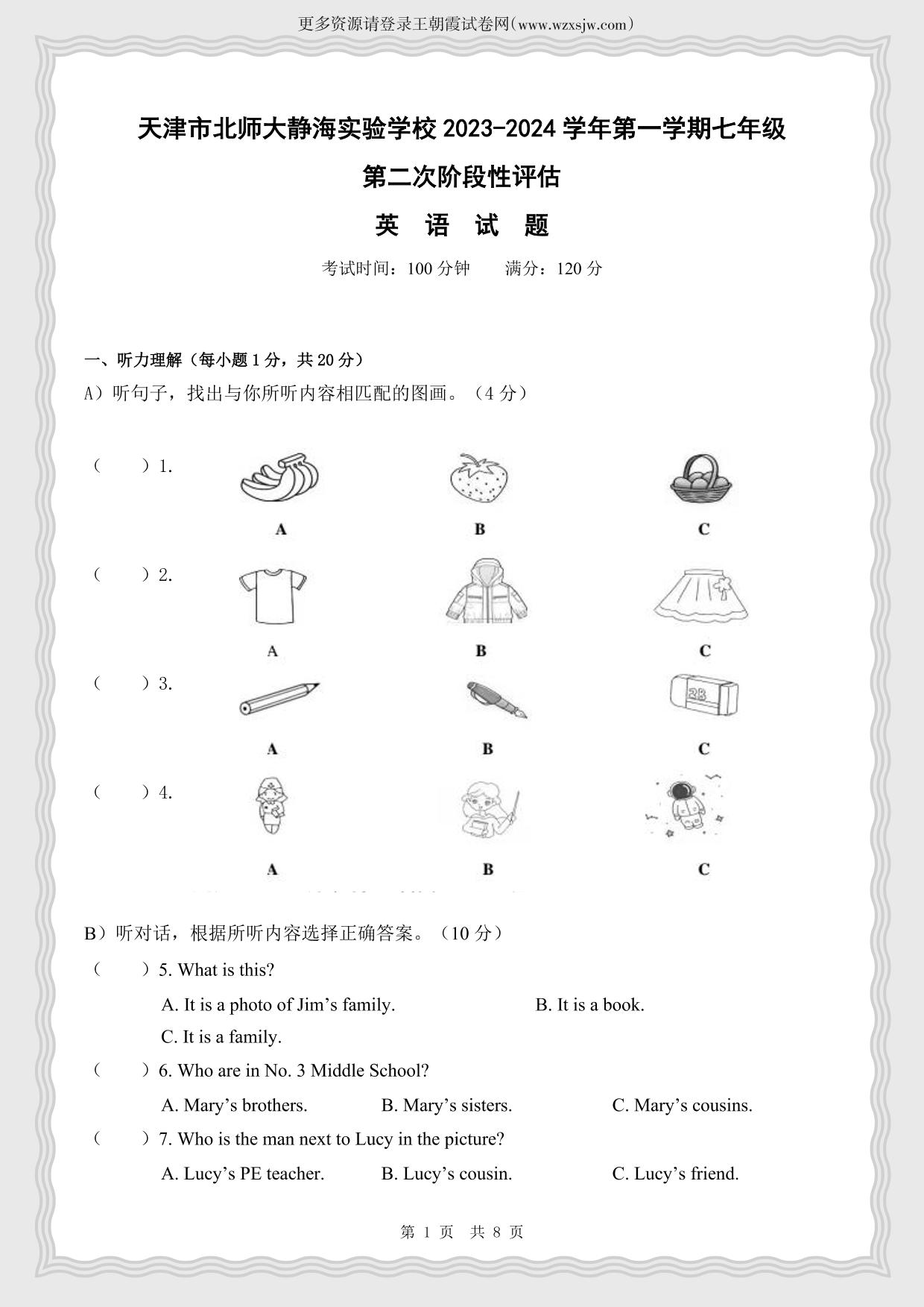 天津市北师大静海实验学校2023-2024学年第一学期第二次阶段性评估试题七年级英语(外研版)