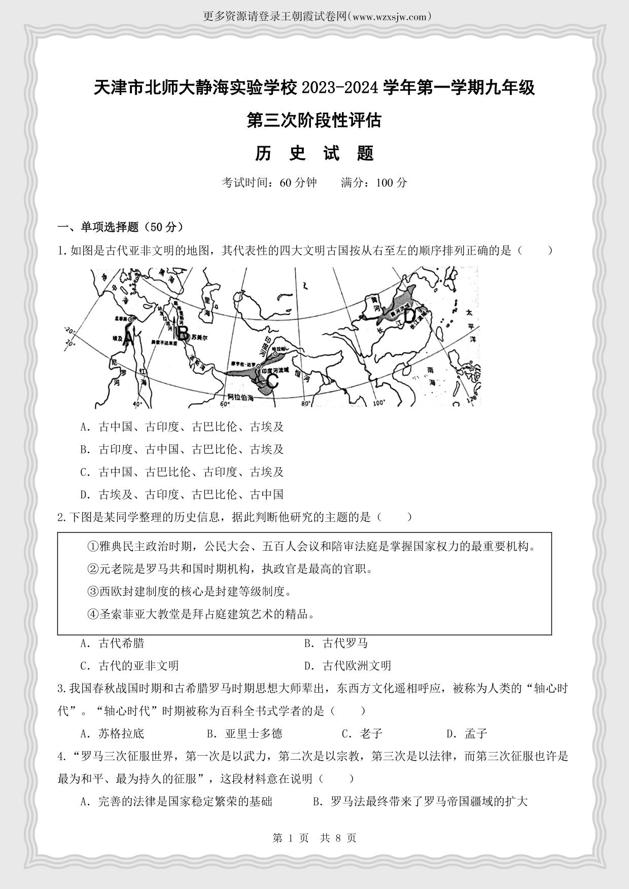 天津市北师大静海实验学校2023-2024学年第一学期第三次阶段性评估(月考)九年级历史(人教版)