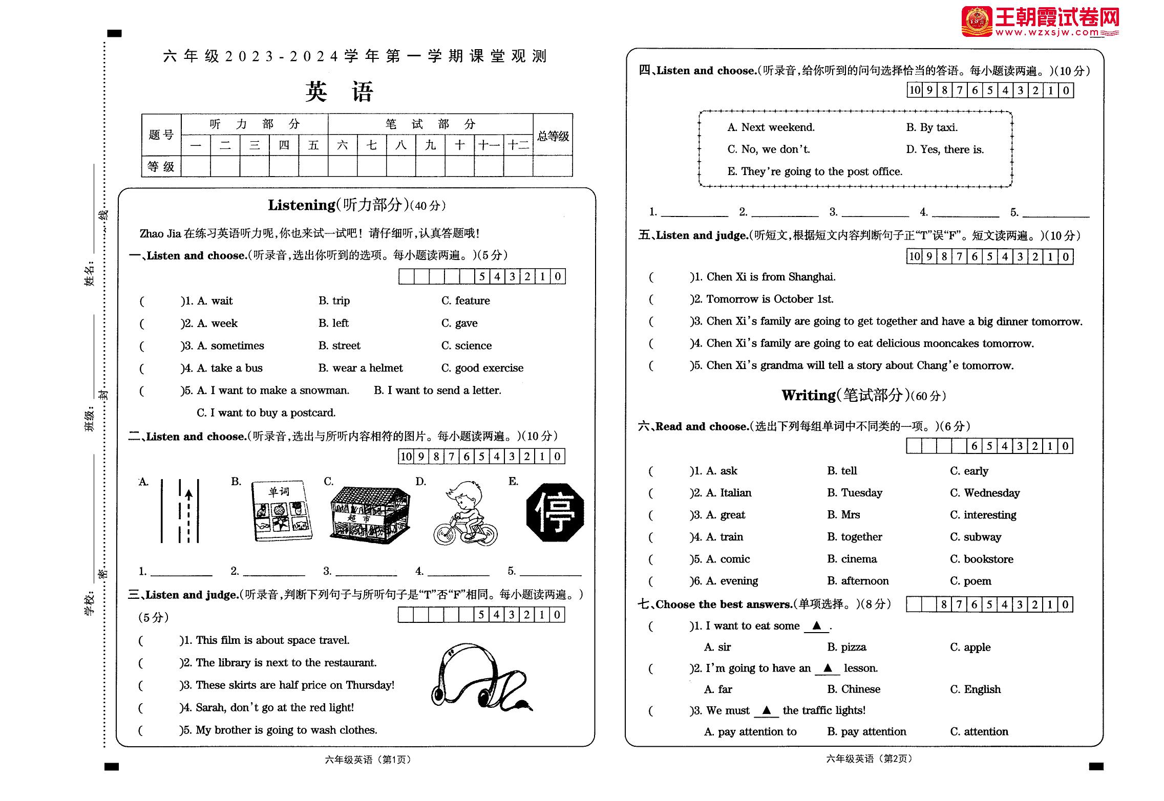 山西省大同市新荣区2023-2024学年第一学期期中课堂观测六年级英语(人教PEP版)