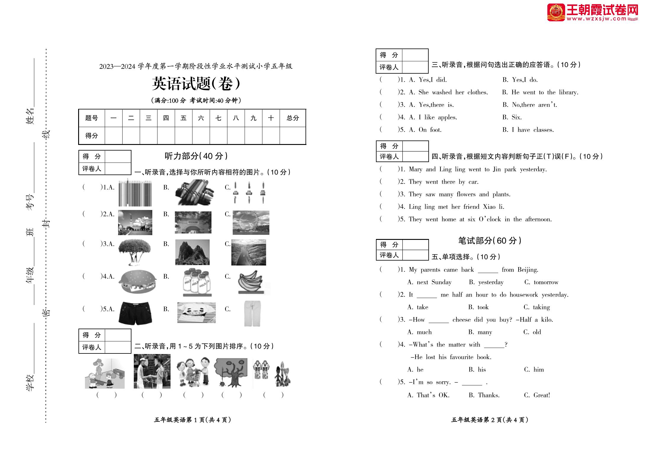山西省临汾市曲沃县2023-2024学年度第一学期期中阶段性学业水平测试五年级英语(外研版)