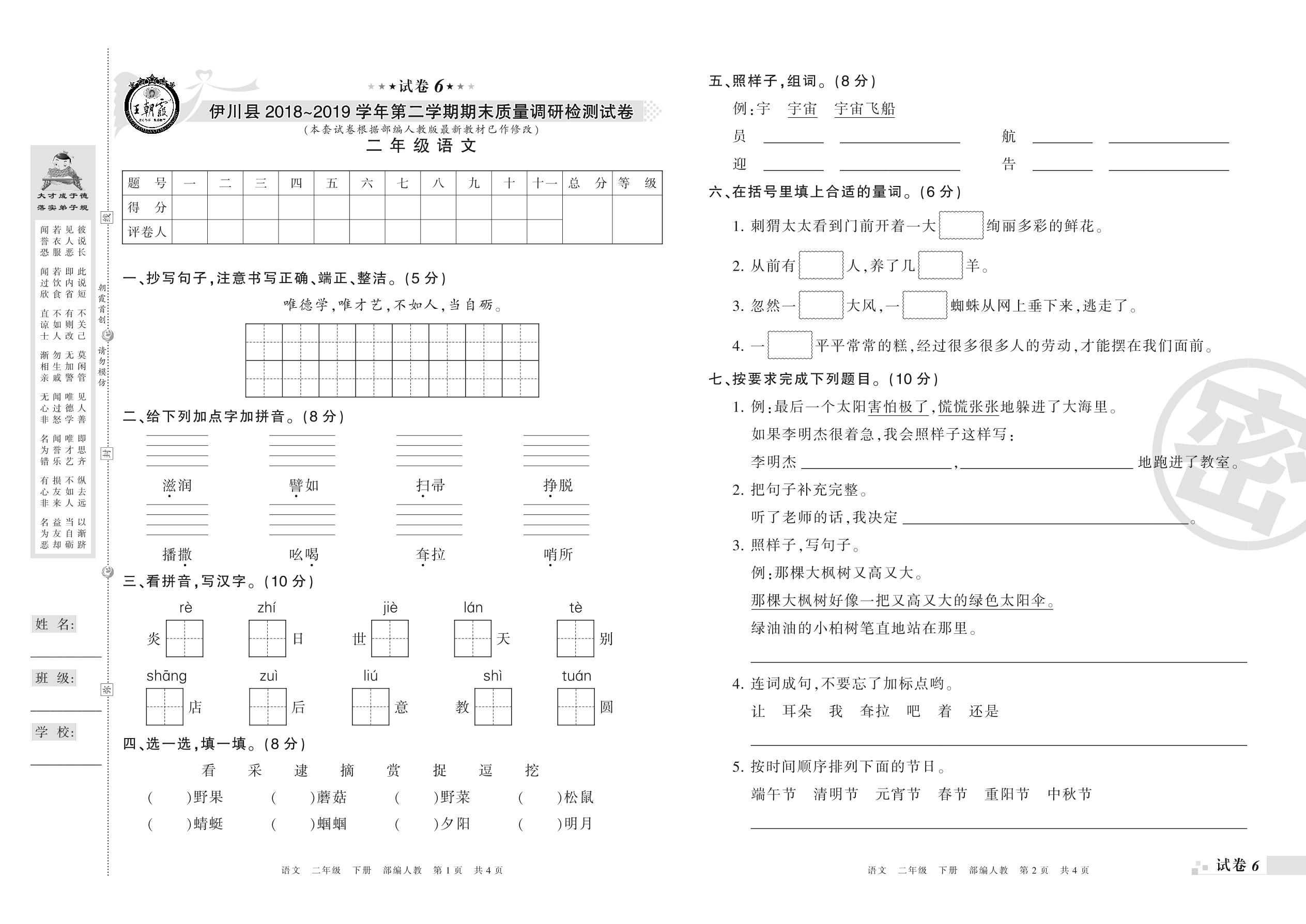 2018-2019学年第二学期洛阳市伊川县二年级语文试卷(人教版)【6】