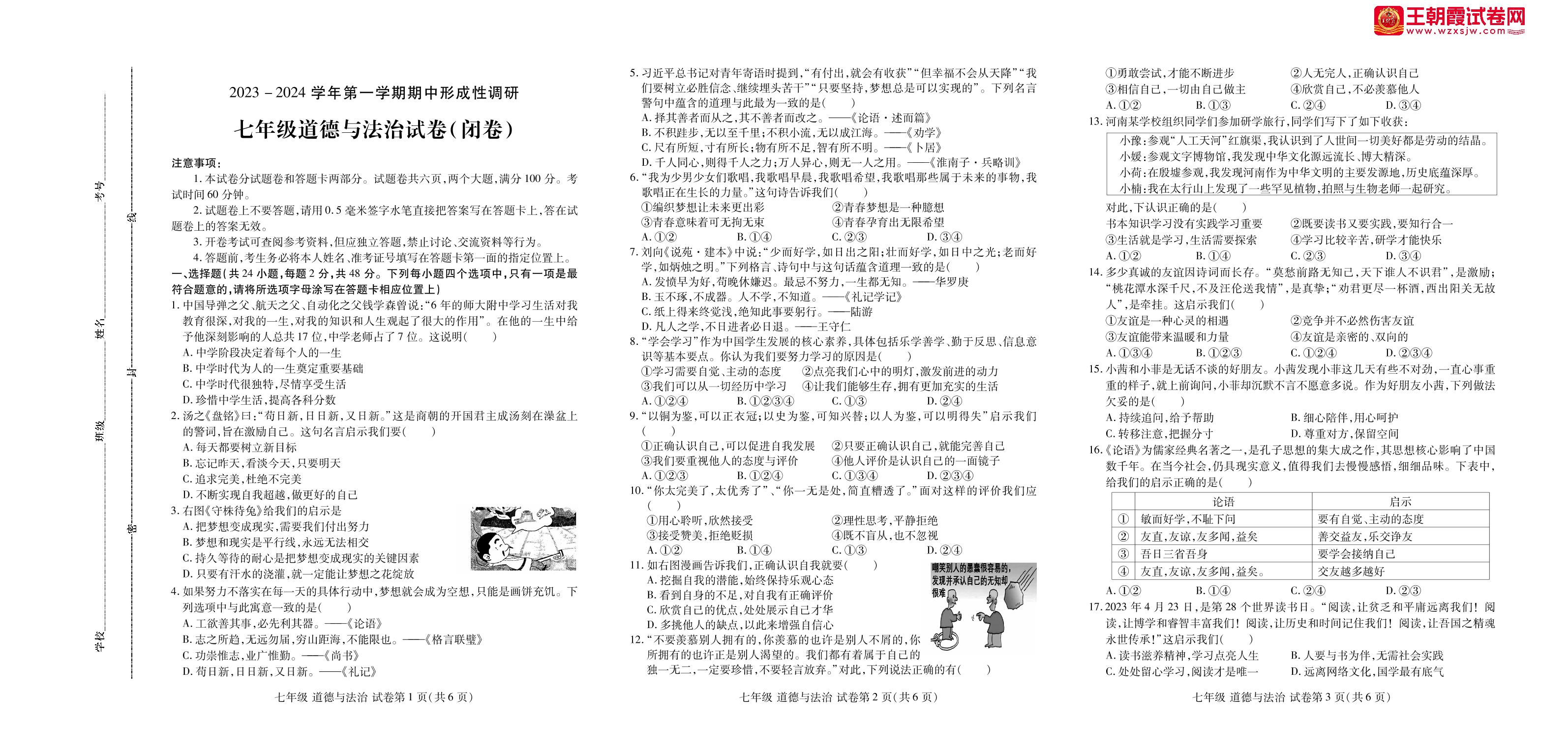 河南省洛阳市洛龙区2023-2024学年第一学期期中形成性调研试卷七年级道德与法治(人教版)
