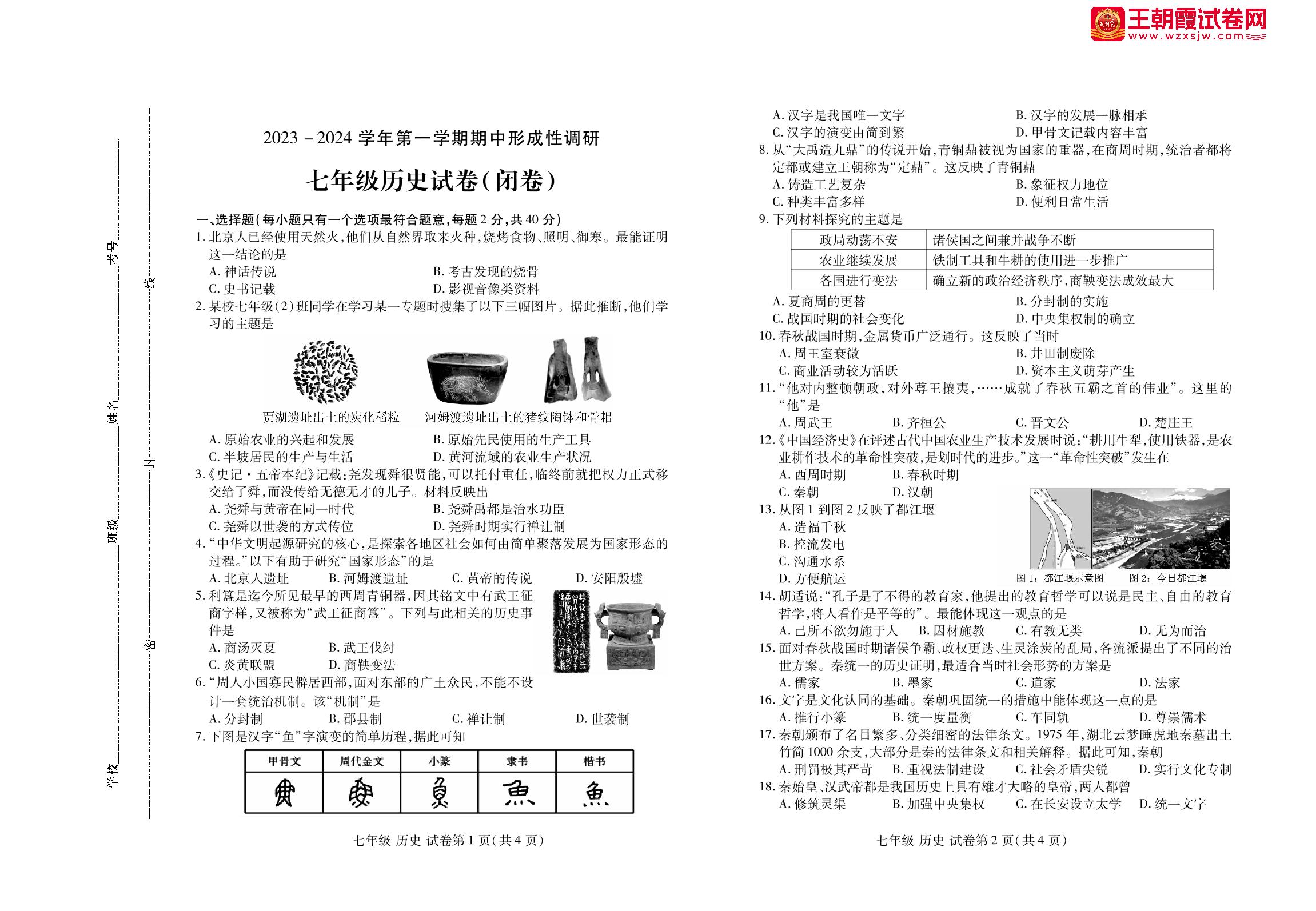 河南省洛阳市洛龙区2023-2024学年第一学期期中形成性调研试卷七年级历史(人教版)