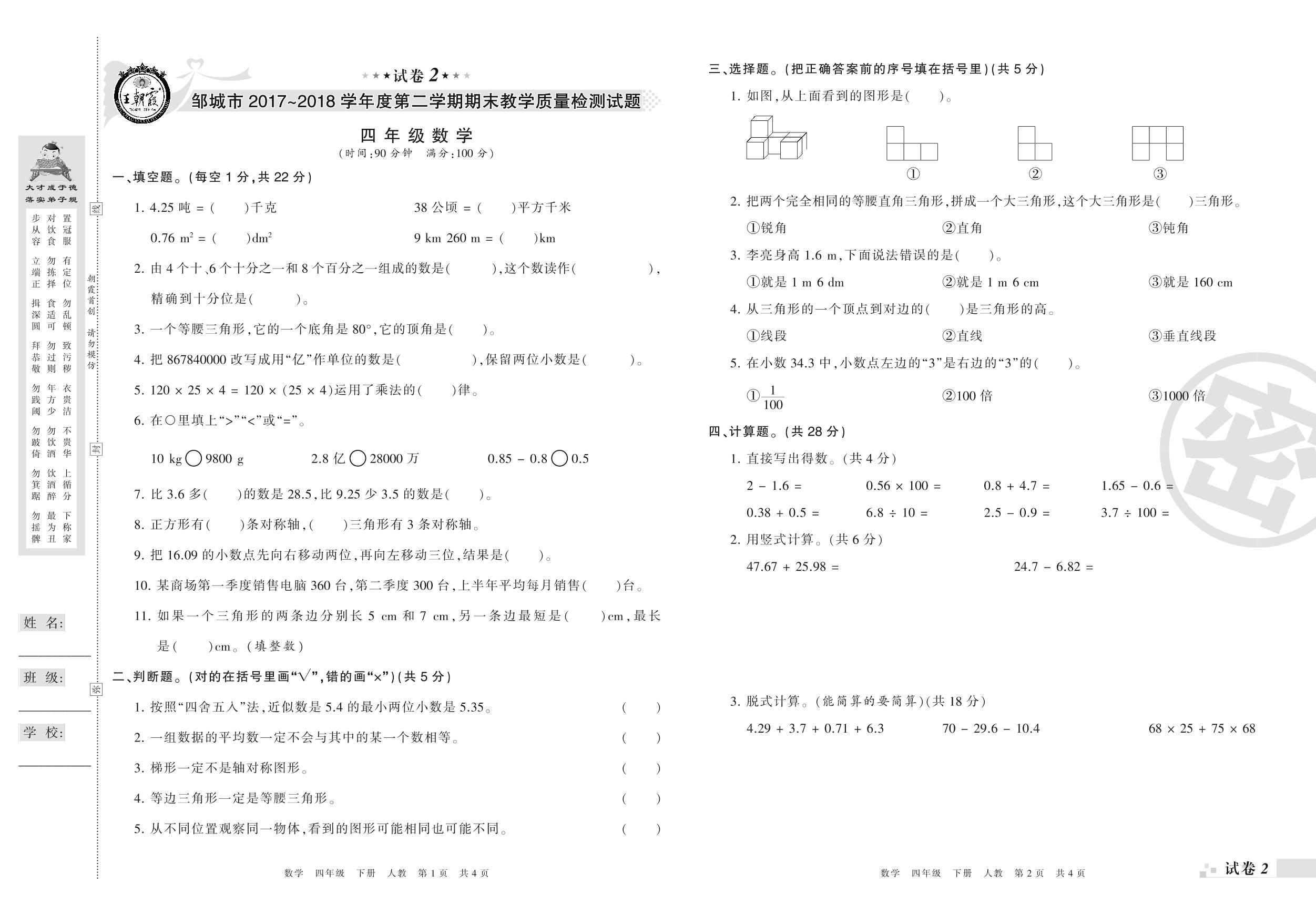 2017-2018学年第二学期邹城市四年级数学试卷(人教版)【2】