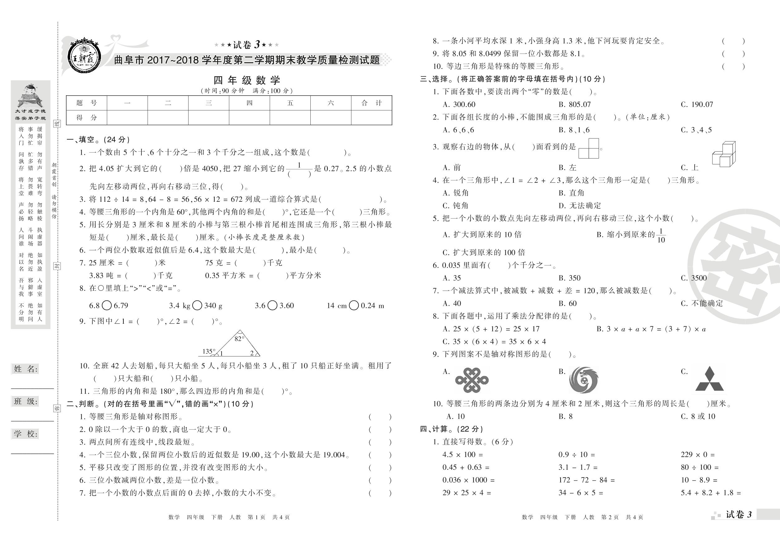 2017-2018学年第二学期曲阜市四年级数学试卷(人教版)【3】