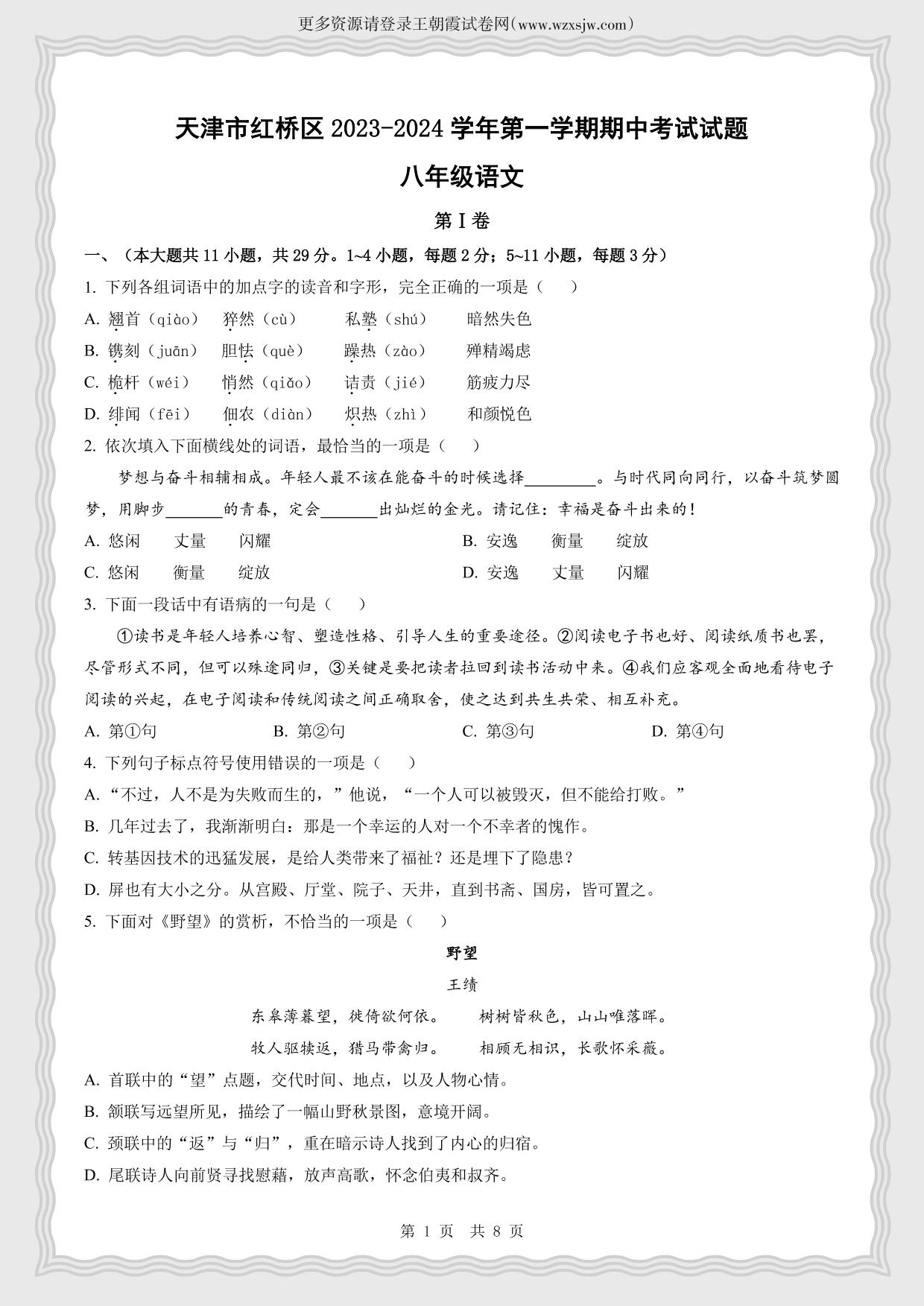 天津市红桥区2023-2024学年第一学期期中考试试题八年级语文(人教版)正文