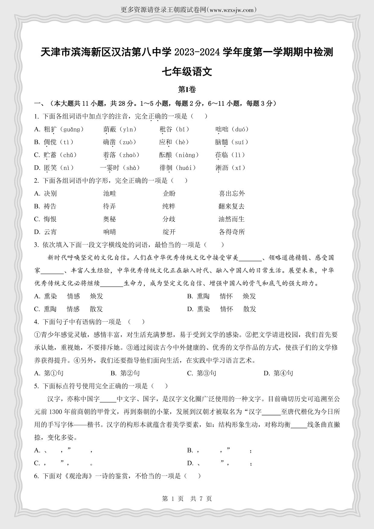 天津市滨海新区汉沽第八中学2023-2024学年度第一学期期中检测七年级语文(人教版)