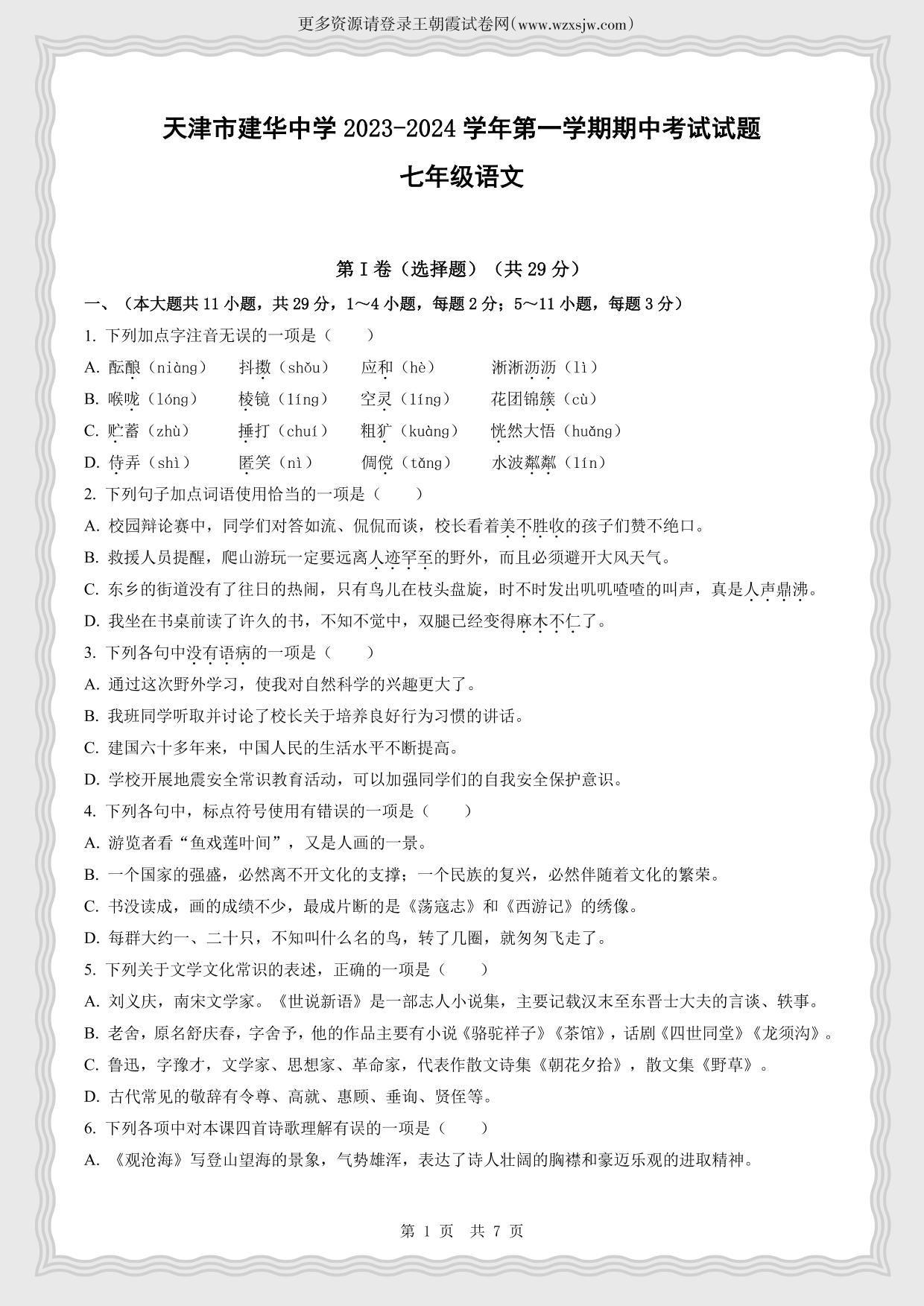 天津市建华中学2023-2024学年第一学期期中考试试题七年级语文(人教版)