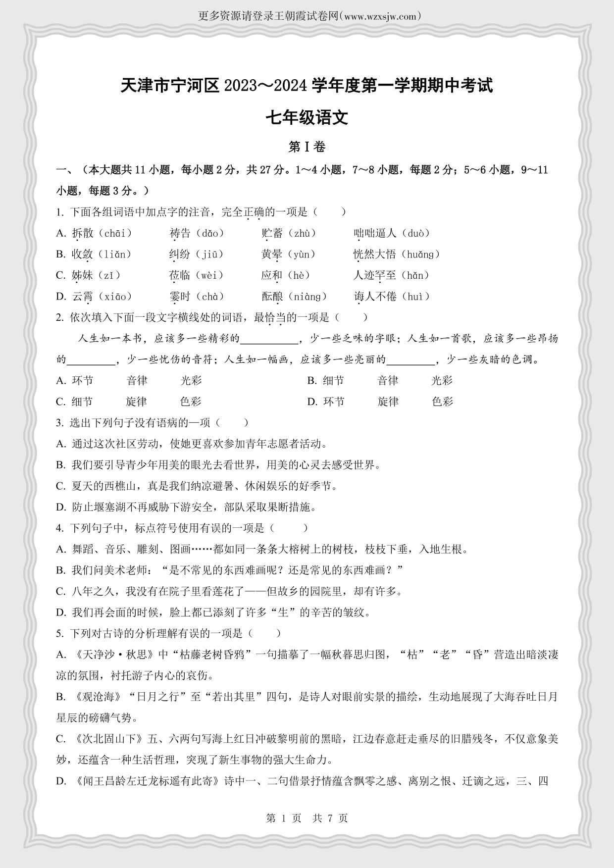 天津市宁河区2023-2024学年度第一学期期中考试七年级语文(人教版)