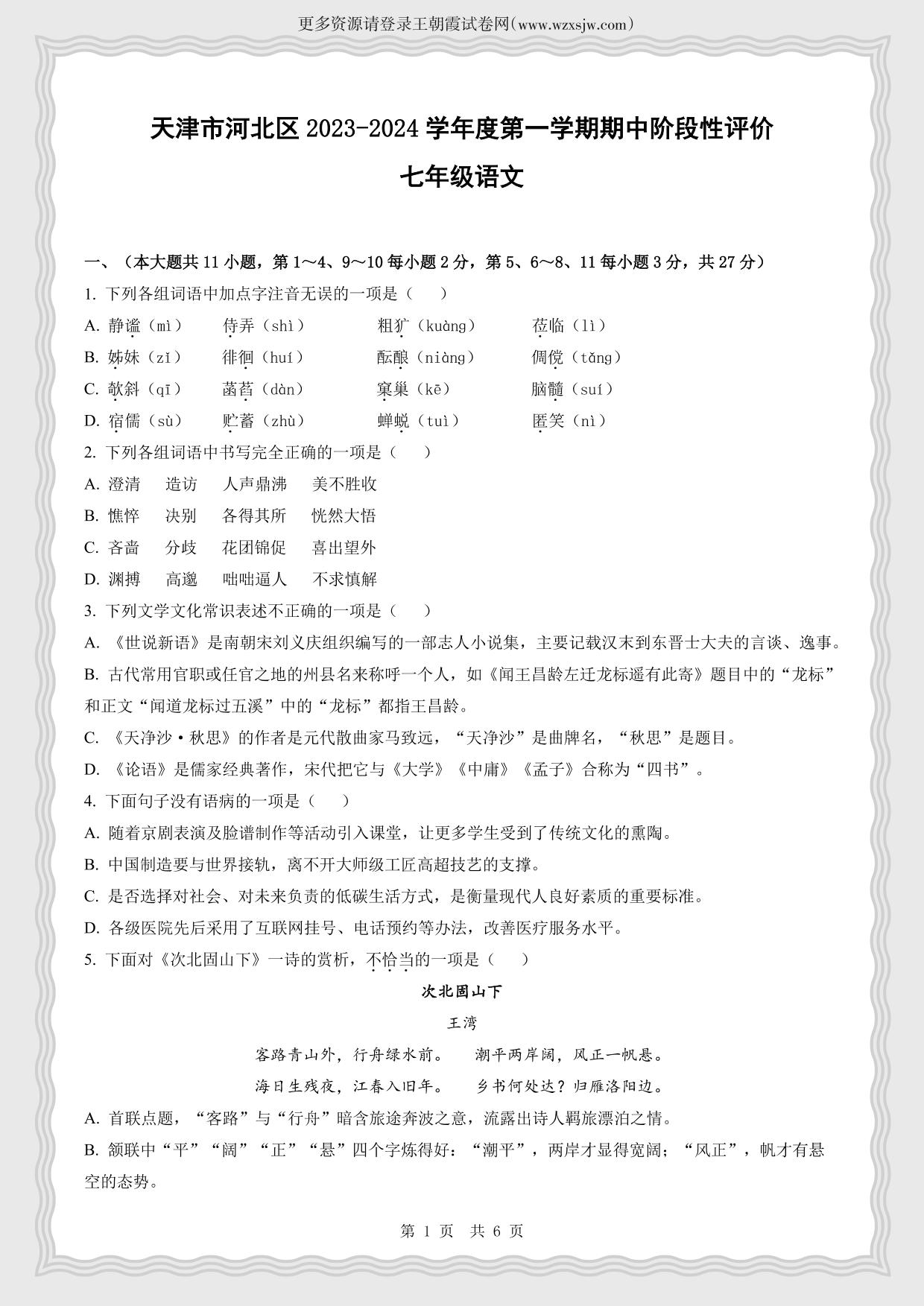天津市河北区2023-2024学年度第一学期期中阶段性评价七年级语文(人教版)