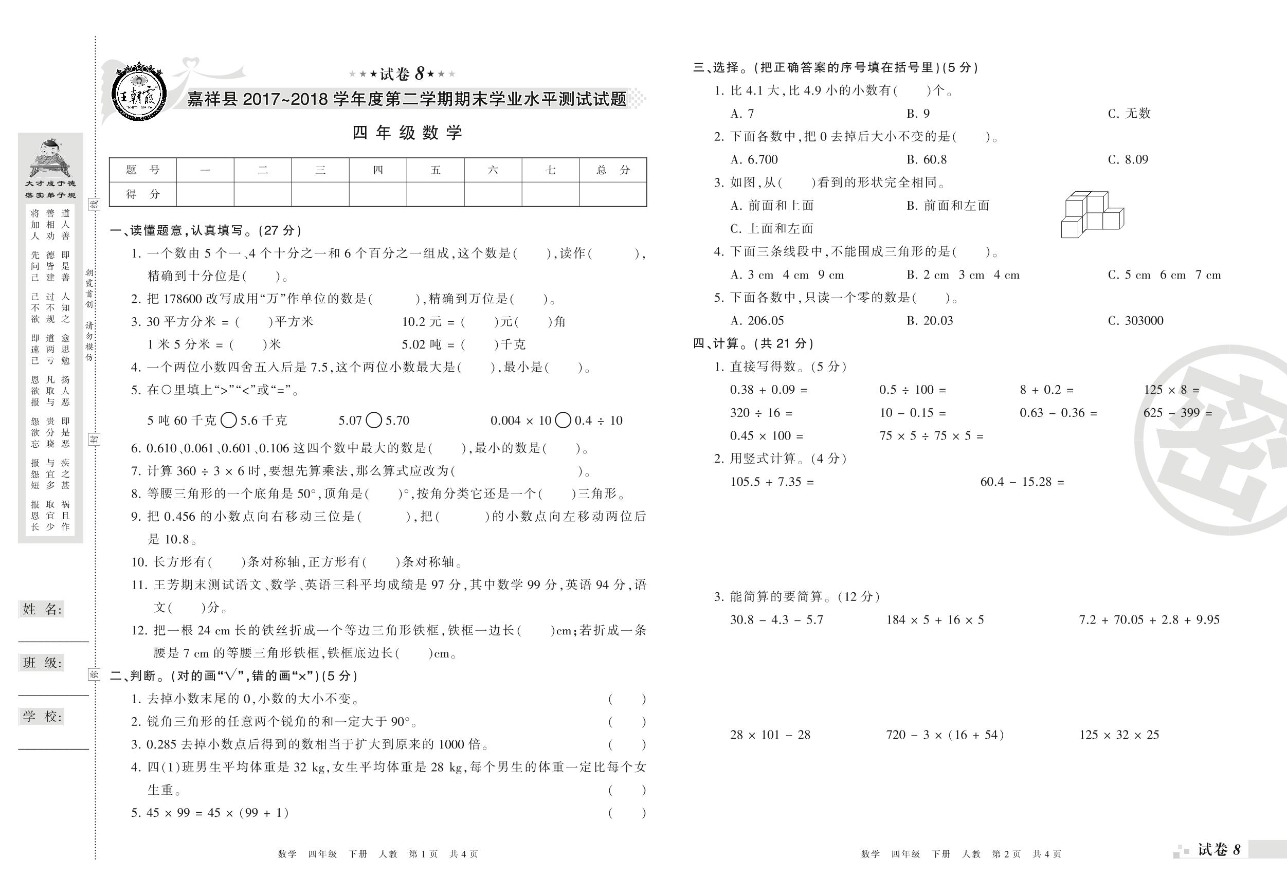 2017-2018学年第二学期济宁市嘉祥县四年级数学试卷(人教版)【8】