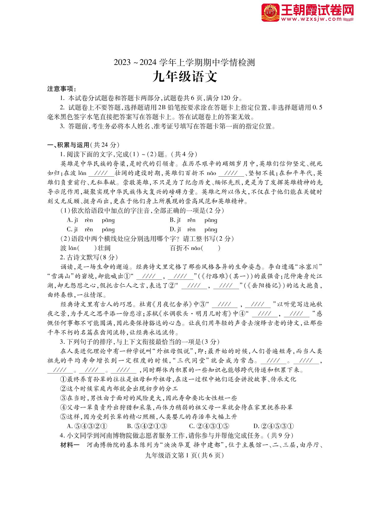 河南省平顶山市郏县2023-2024学年上学期期中学情检测试卷九年级语文(人教版)