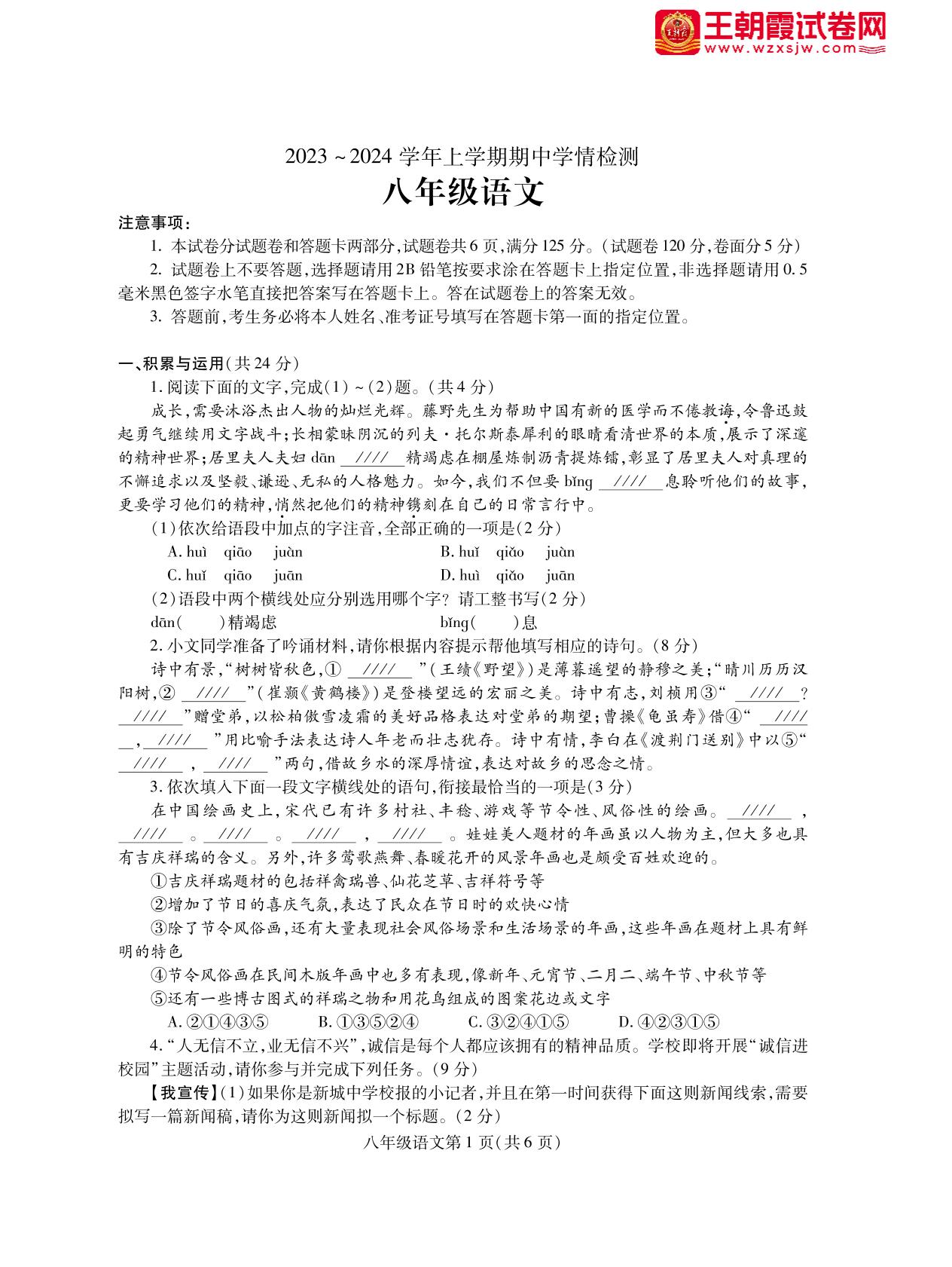 河南省平顶山市郏县2023-2024学年上学期期中学情检测试卷八年级语文(人教版)