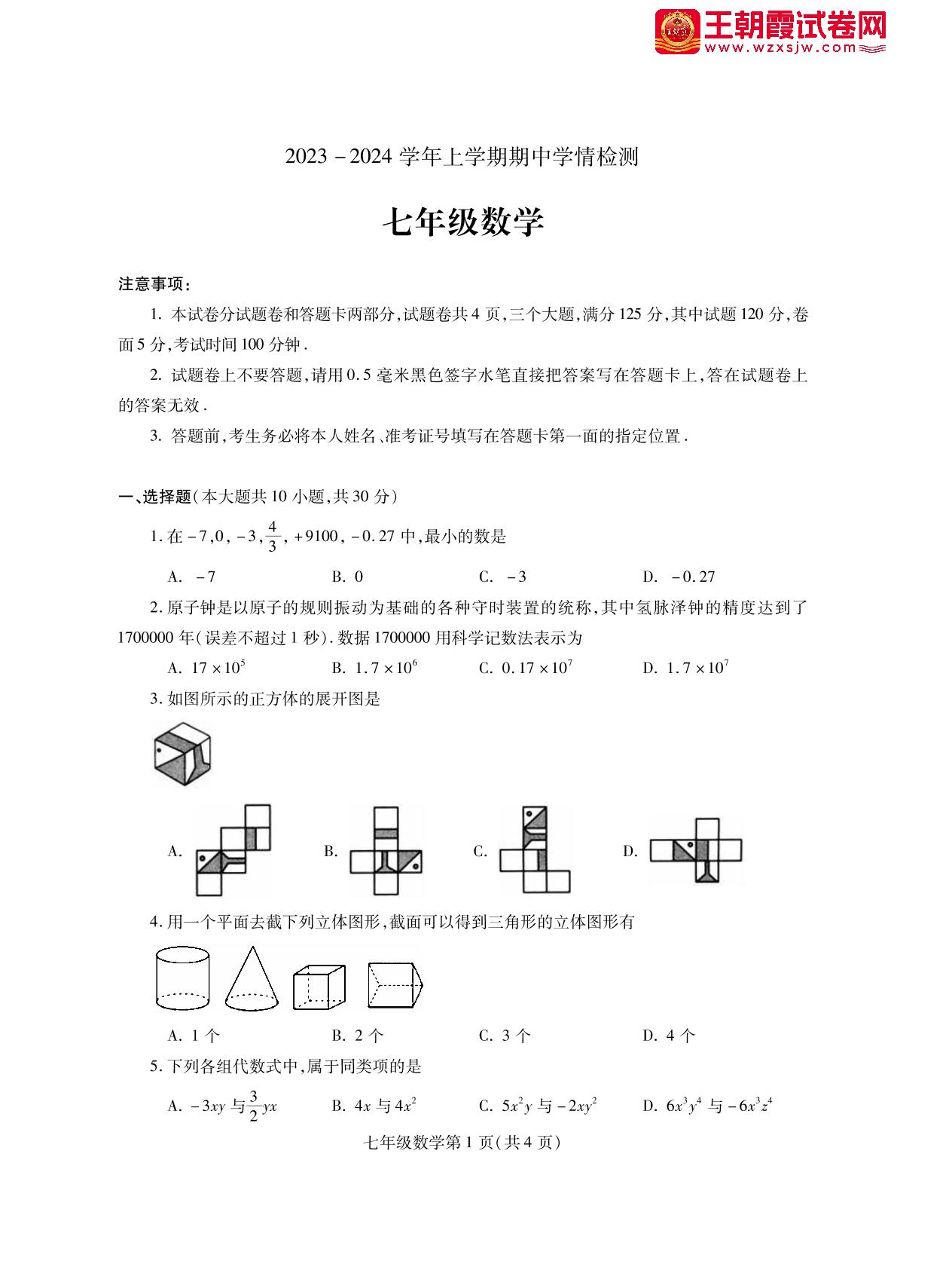 河南省平顶山市郏县2023-2024学年上学期期中学情检测试卷七年级数学(北师版)