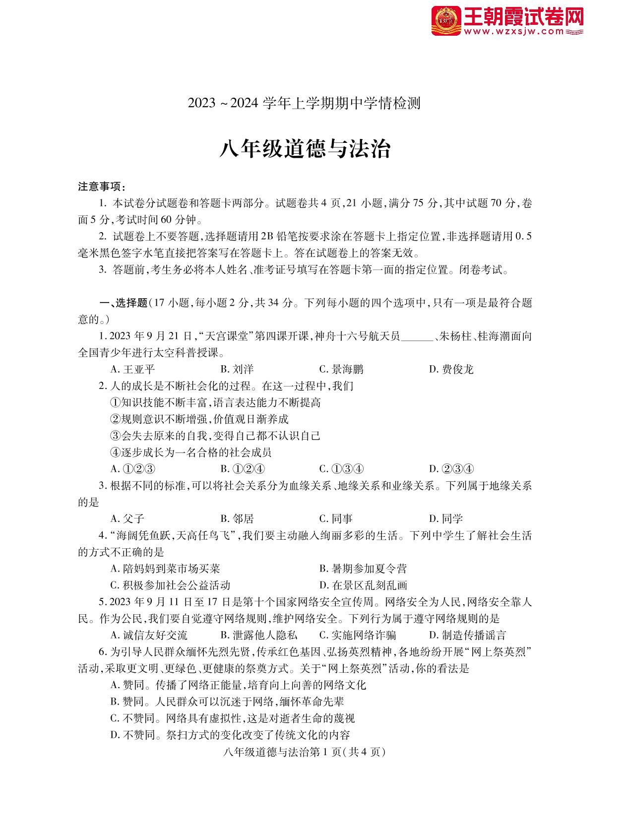 河南省平顶山市郏县2023-2024学年上学期期中学情检测试卷八年级道德与法治(人教版)