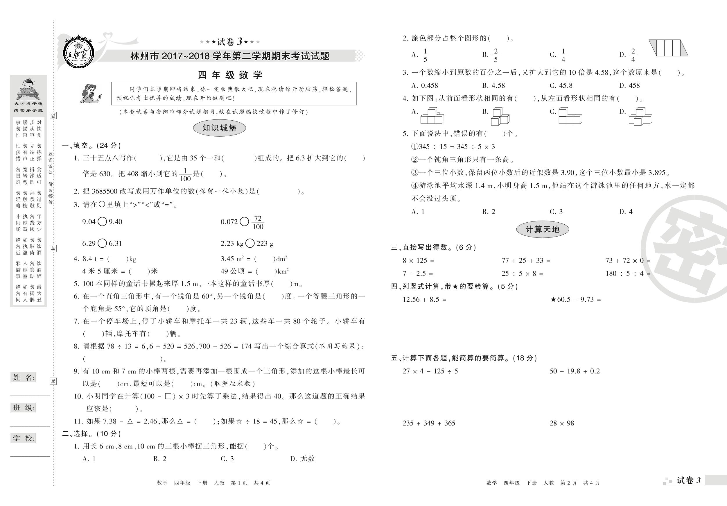 2017-2018学年第二学期林州市四年级数学试卷(人教版)【3】