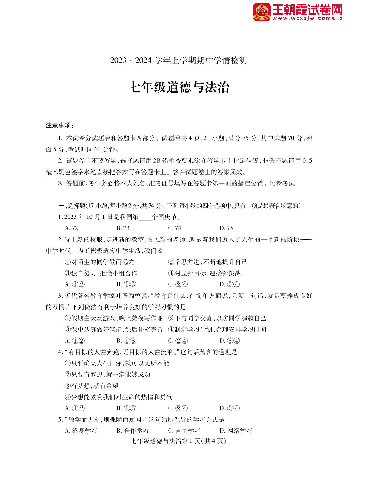 河南省平顶山市郏县2023-2024学年上学期期中学情检测试卷七年级道德与法治(人教版)