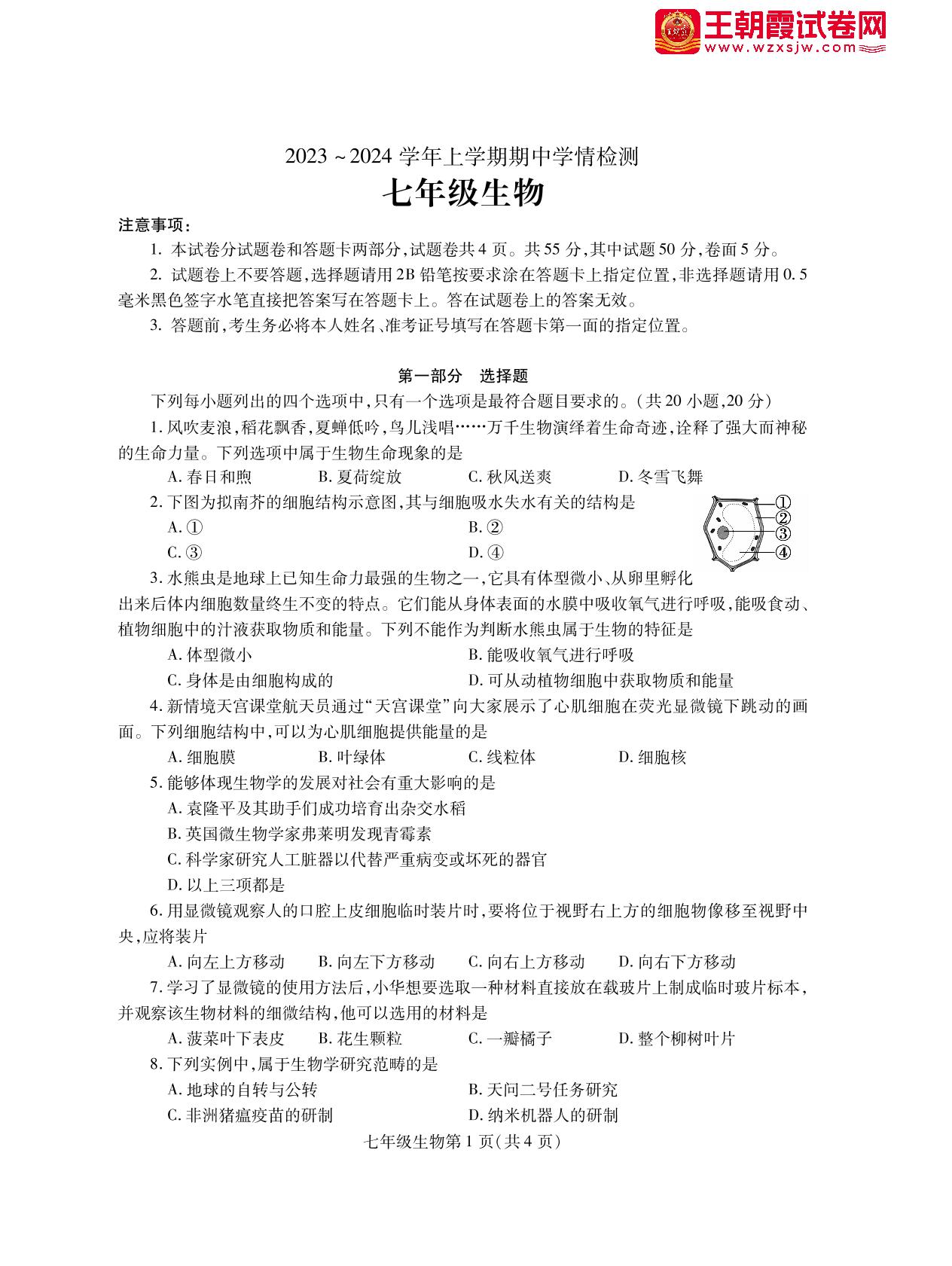 河南省平顶山市郏县2023-2024学年上学期期中学情检测试卷七年级生物(苏教版)
