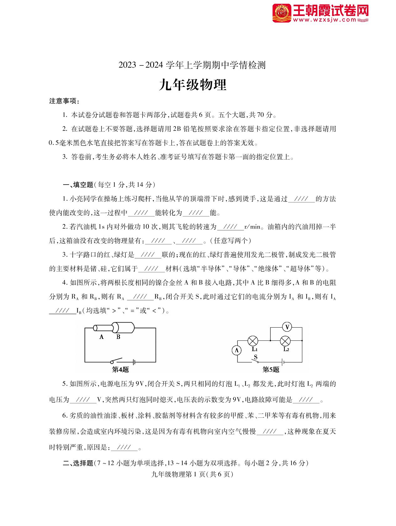 河南省平顶山市郏县2023-2024学年上学期期中学情检测试卷九年级物理(人教版)
