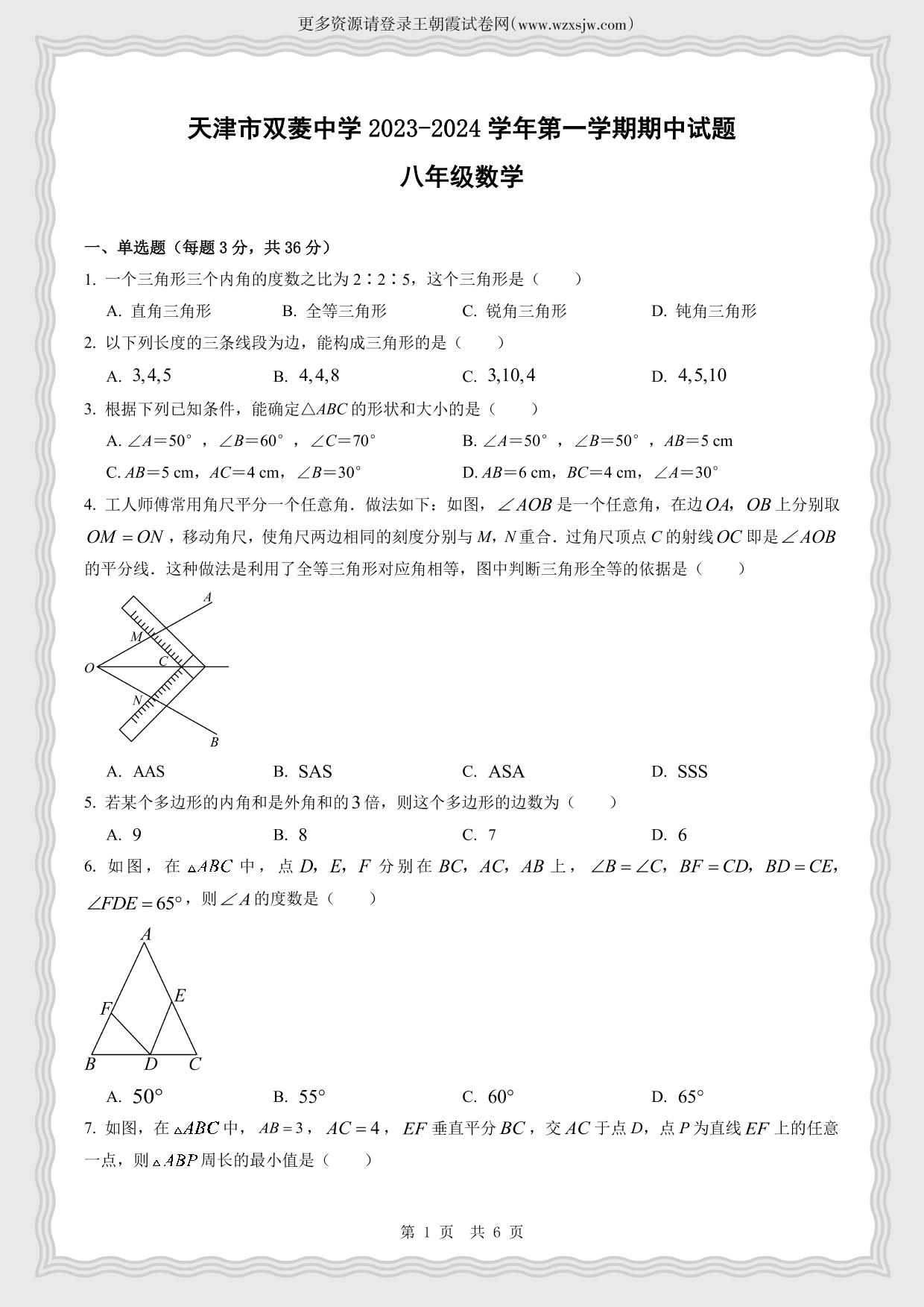 天津市和平区双菱中学2023-2024学年第一学期期中试题八年级数学(人教版)