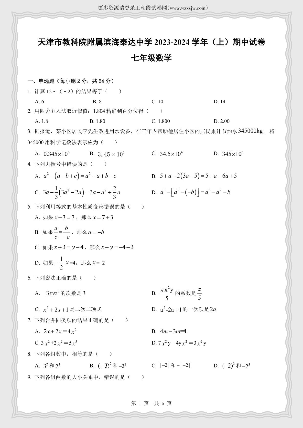 天津市和平区泰达中学2023-2024学年第一学期期中试题七年级数学(人教版)