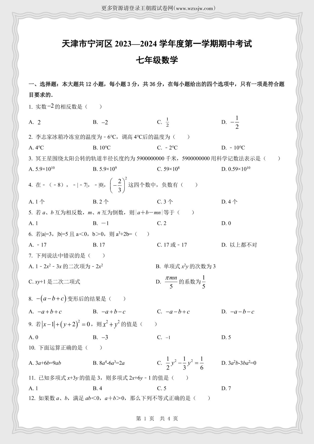 天津市宁河区2023-2024学年第一学期期中试题七年级数学(人教版)