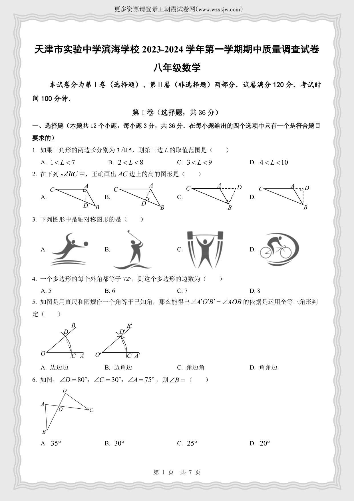 天津市实验中学滨海学校2023-2024学年第一学期期中试题八年级数学(人教版)